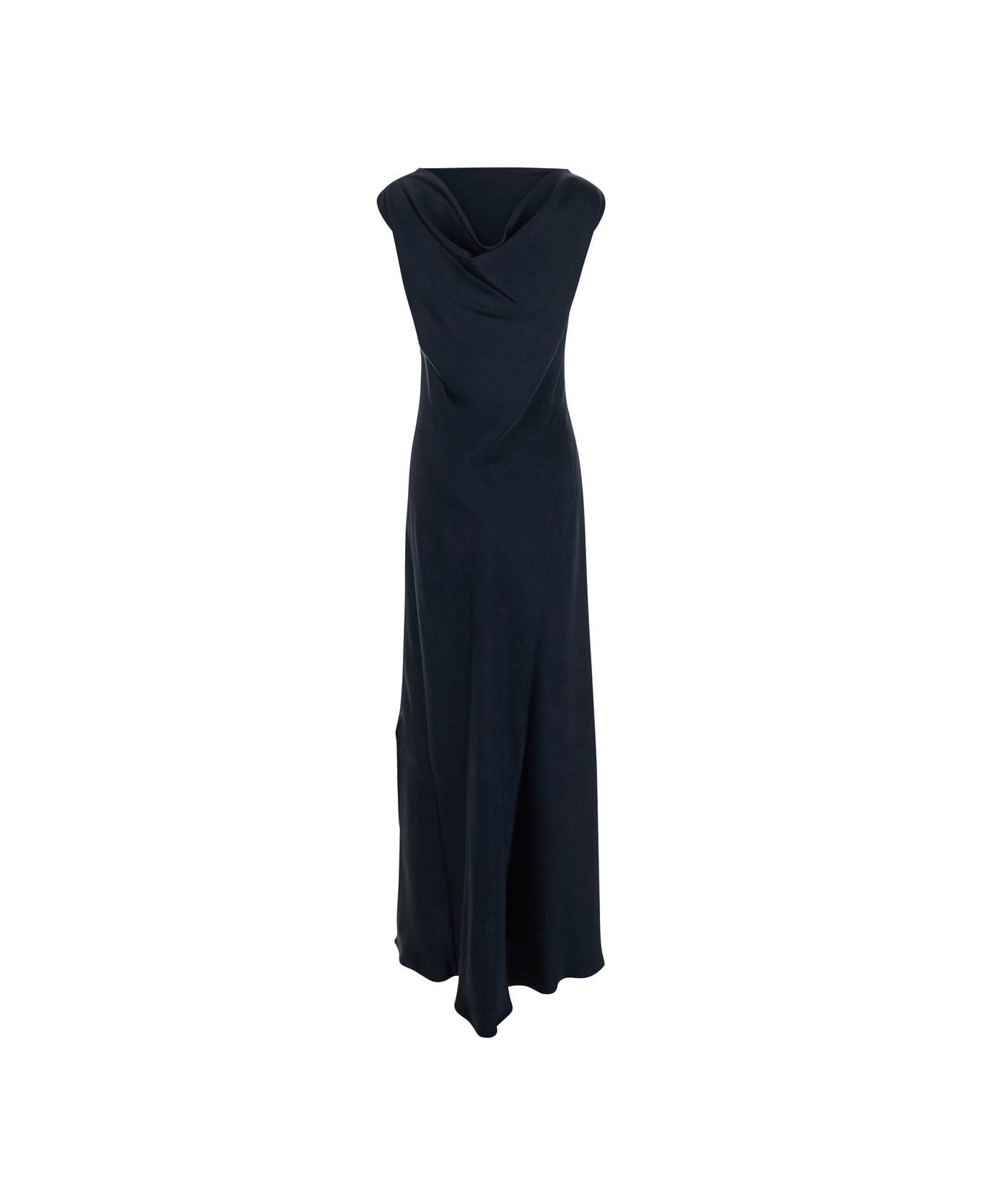 Long dress Blue Boat neckline Sleeveless Ruched detail on the rear Side single slit Straight hem Viscose blend Regular fit