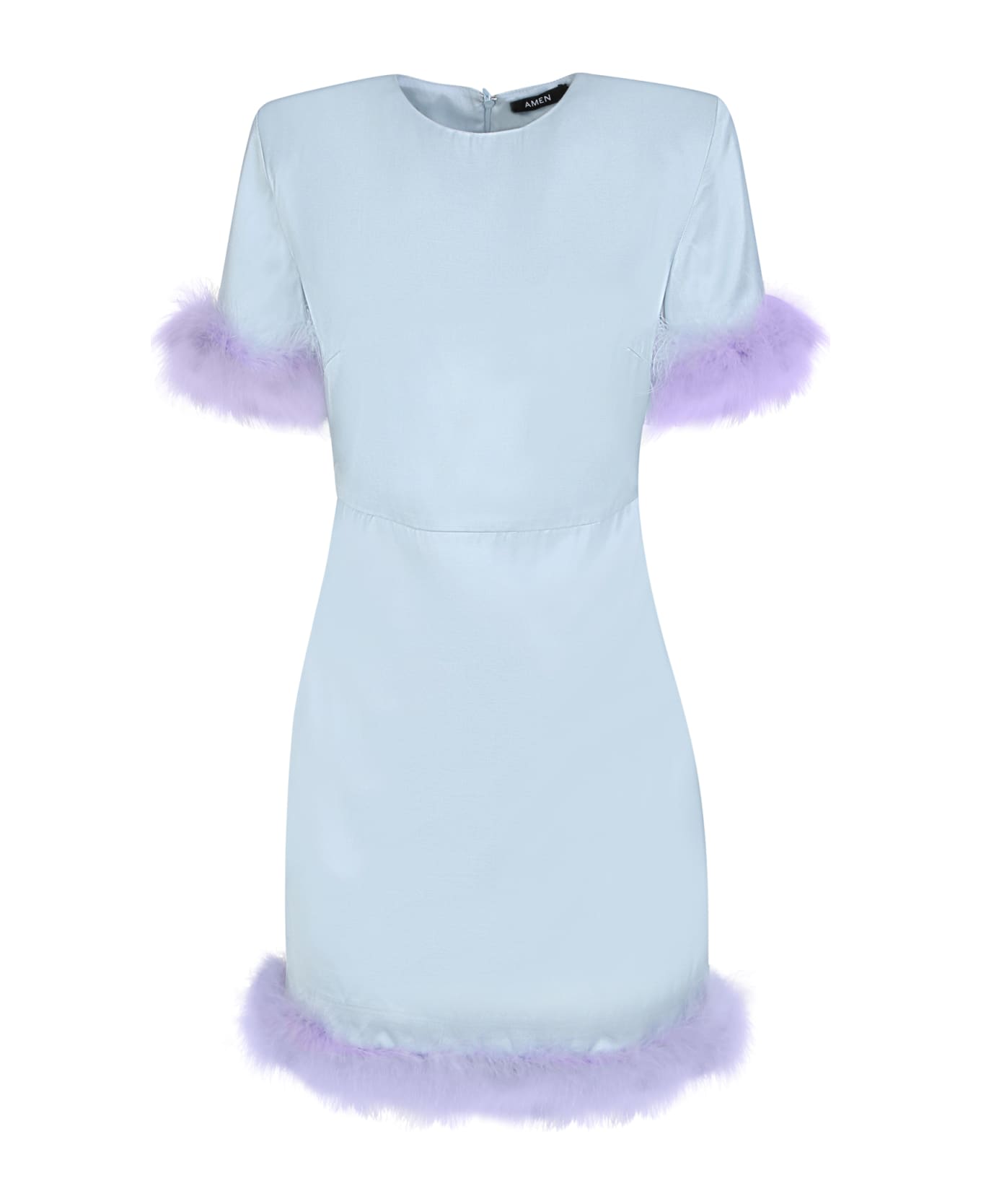 Round neckline. Short sleeves. Rear zip fastening. Contrasting feather detailing. Thigh length. Color: light blue/ lilac