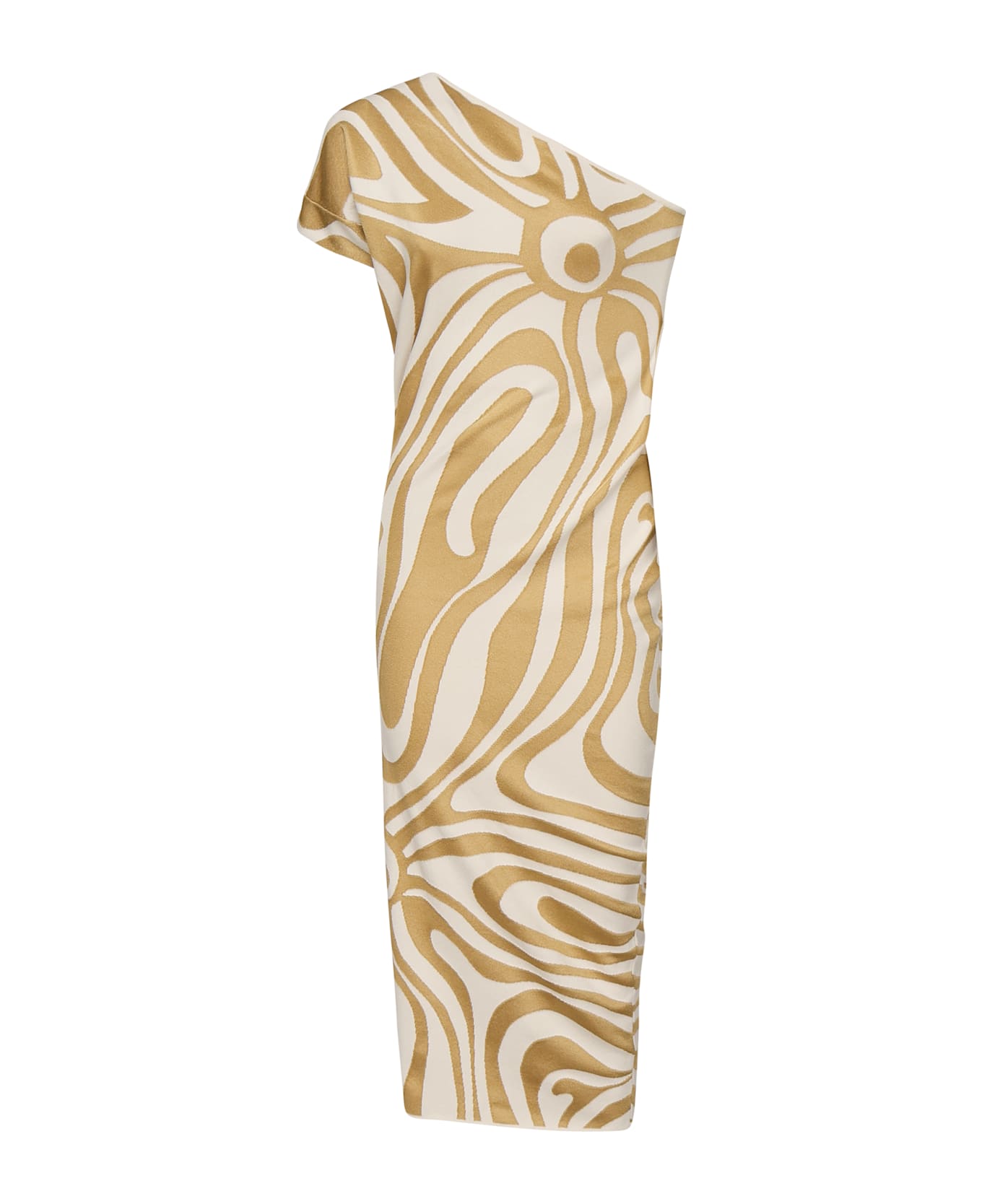 -Draped on the upper part -Midi length -Made in Italy -The size shown in the photo is S -Colors: Ecru and gold