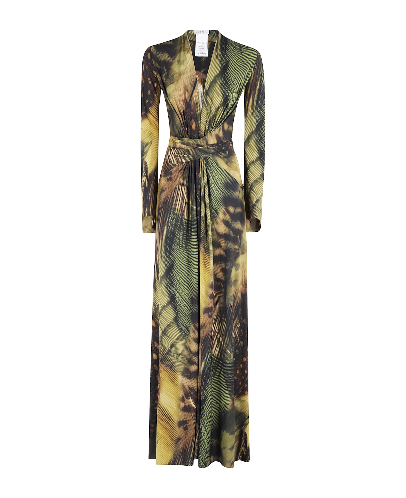 Margot Jungle dress - Amazuin - Green color - Lightweight jersey fabric with Jungle pattern - Wide V-neck - Long sleeve - Waist sash - Long skirt with slit - Fitted fit.