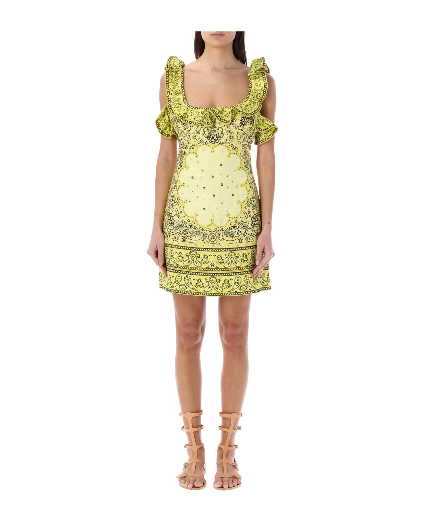 Matchmaker Frilled Mini Dress By Zimmermann. Featuring: Linen Mini Dress Square Neckline With Frill Detail Boning At Bodice Side Seams Cutaway Back With Self Tie Closure Invisible Zip Closure At Centre Back Model Is 1,72 M And Wears Size 1