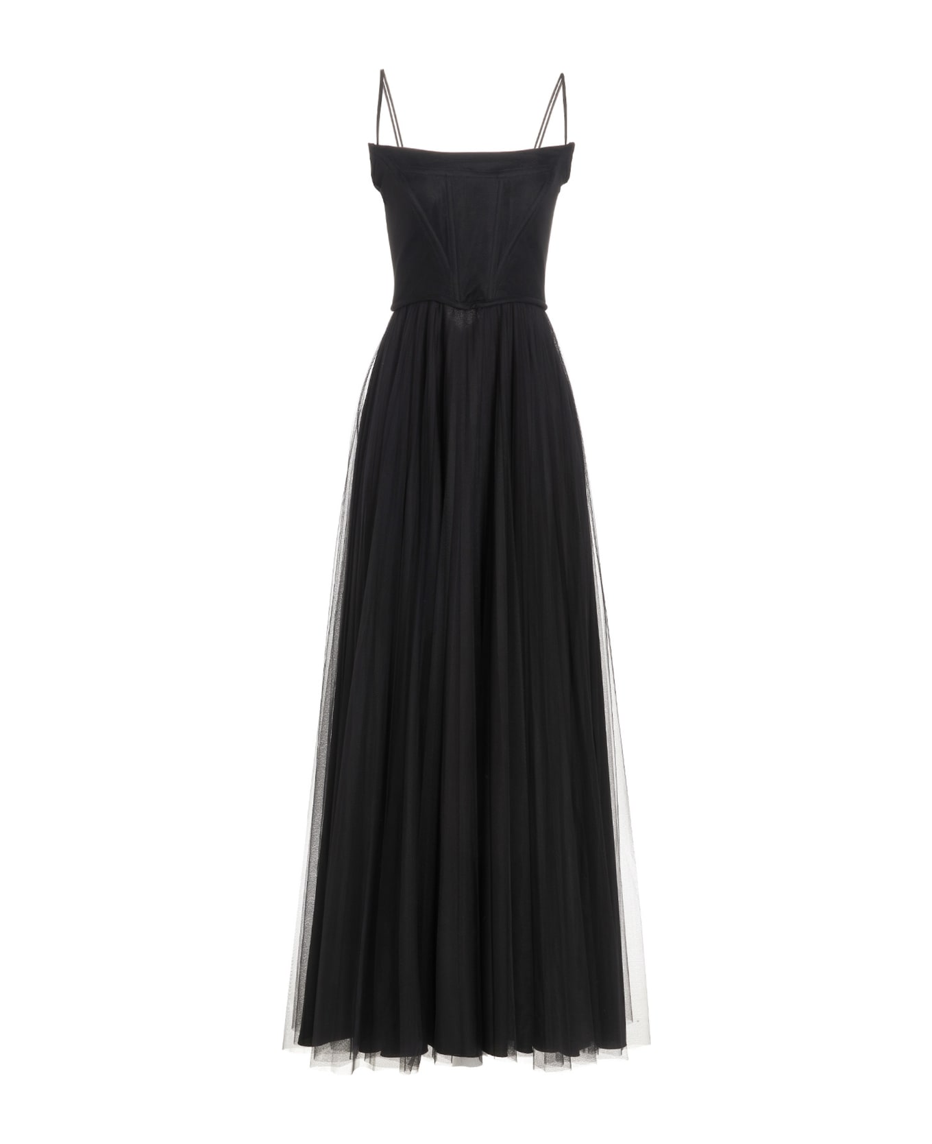 Maxi bustier tulle dress with thin straps and a skirt with micro pleats.