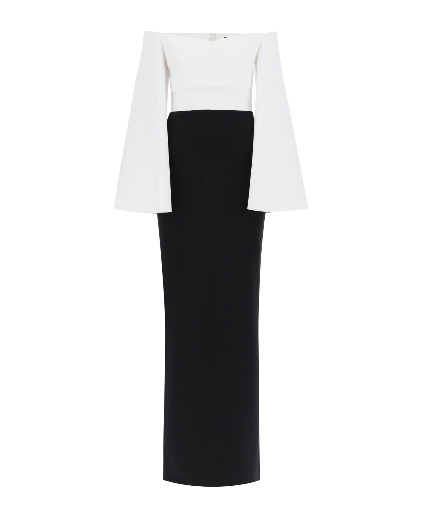 This Solace London dress is made of crepe cady with a color block design featuring a crossover bodice with an off-shoulder neckline and voluminous flared long sleeves. It has a hidden back zip closure and stands out for its fitted silhouette defined by a waist cut. The design is completed by a deep back slit. The model is 177 cm tall and wears a UK size 8.