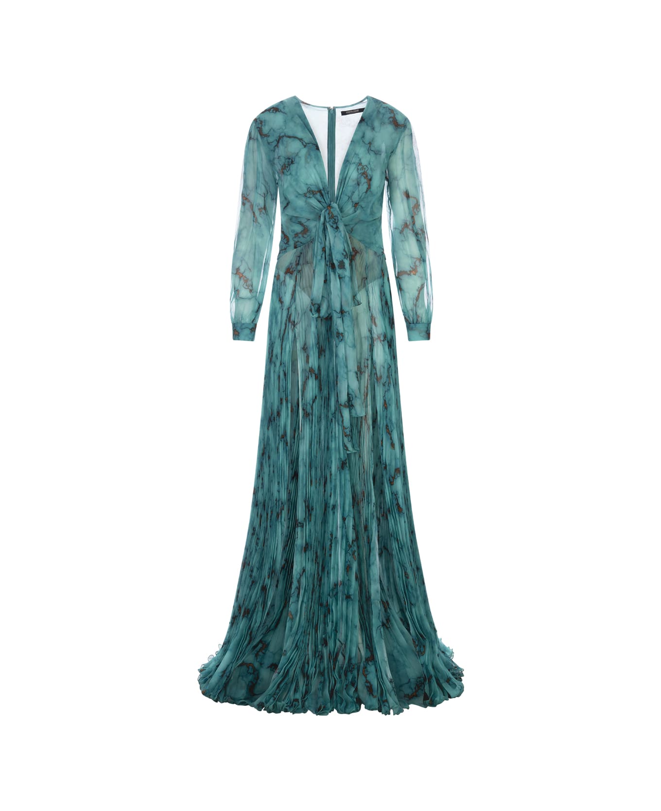 Roberto Cavalli maxi dress made from fluid aquamarine blue marbled silk and featuring a deep V-neckline, long sleeves, button cuffs, a drawstring waist and a pleated skirt with thigh-high slits that create a striking silhouette. Concealed back zip fastening.
