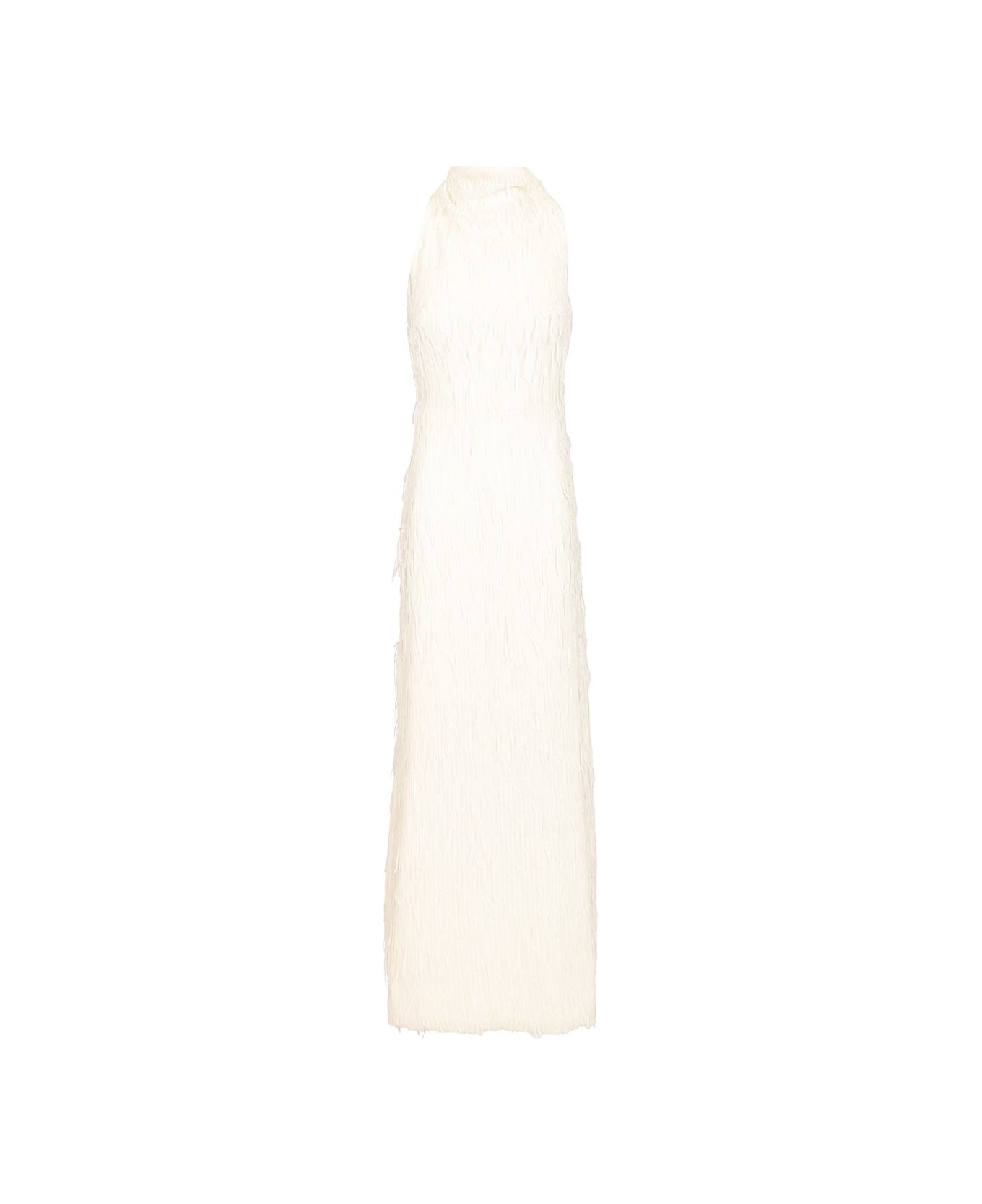 Maxi Halterneck dress in fabric embellished with sparkling fringe details by Rotate, sleeveless with halterneck, high neckline, fitted silhouette, back with a keyhole opening, closed by a button.
