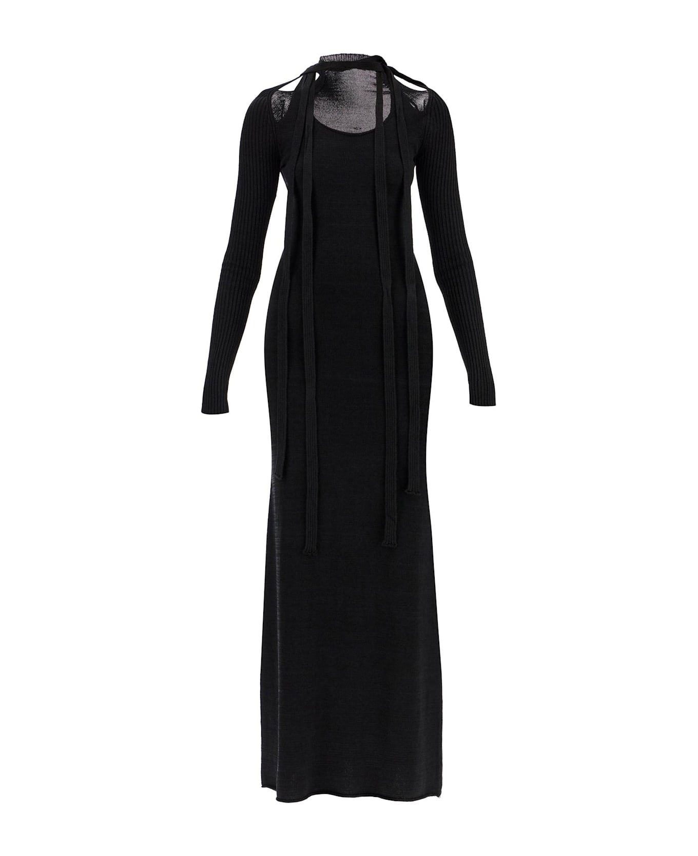 This Y/Project maxi dress is made of textured stretch viscose knit, featuring a straight silhouette with a fitted cut and long sleeves. It has a wide neckline embellished with shoulder cutouts and scarf panels. Finished with a rolled hem. The model is 177 cm tall and wears a size S.