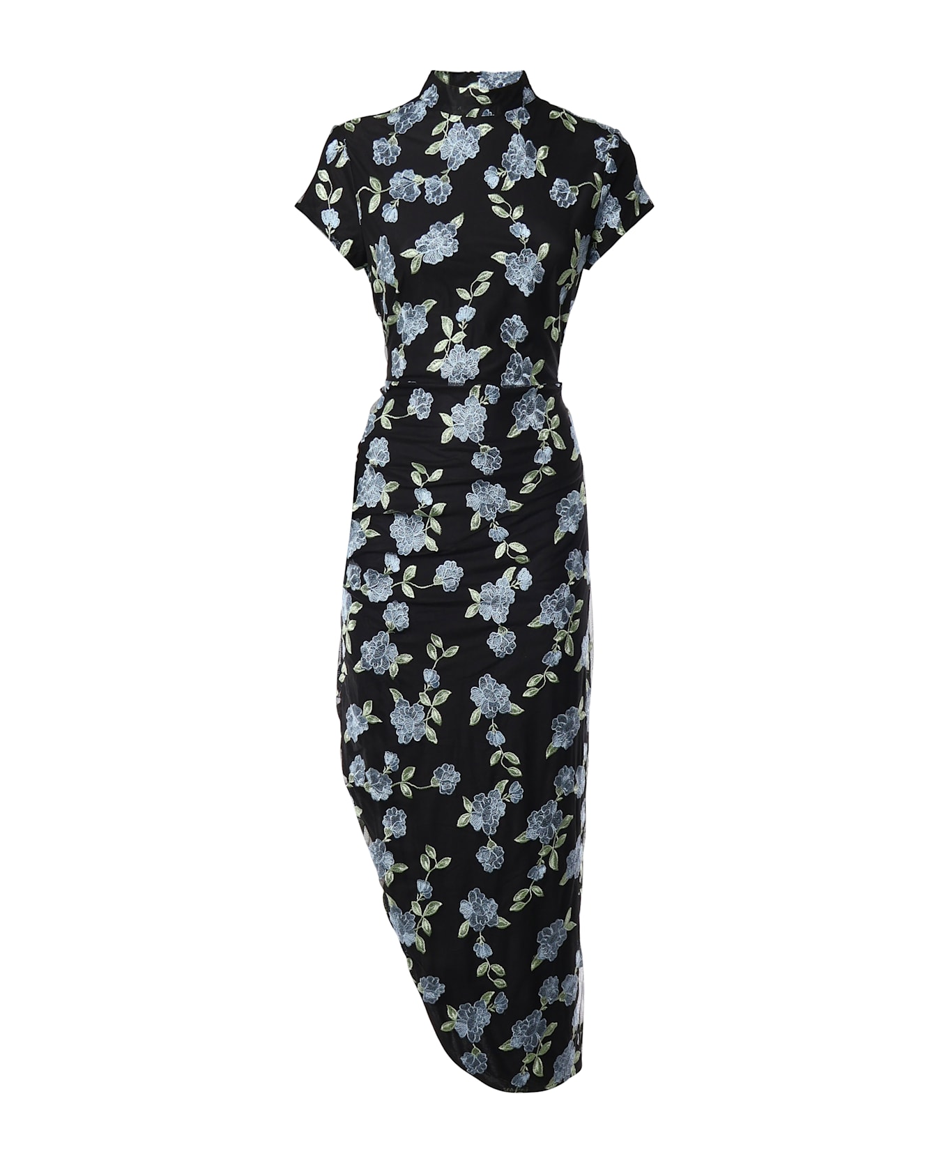 -Mesh asymmetric dress -All over floral pattern -Asymmetric hemline detail with side slit -High collar -Short sleeves -Back zipper closure -Size shown in photo is 38 -Color: Black, Blue