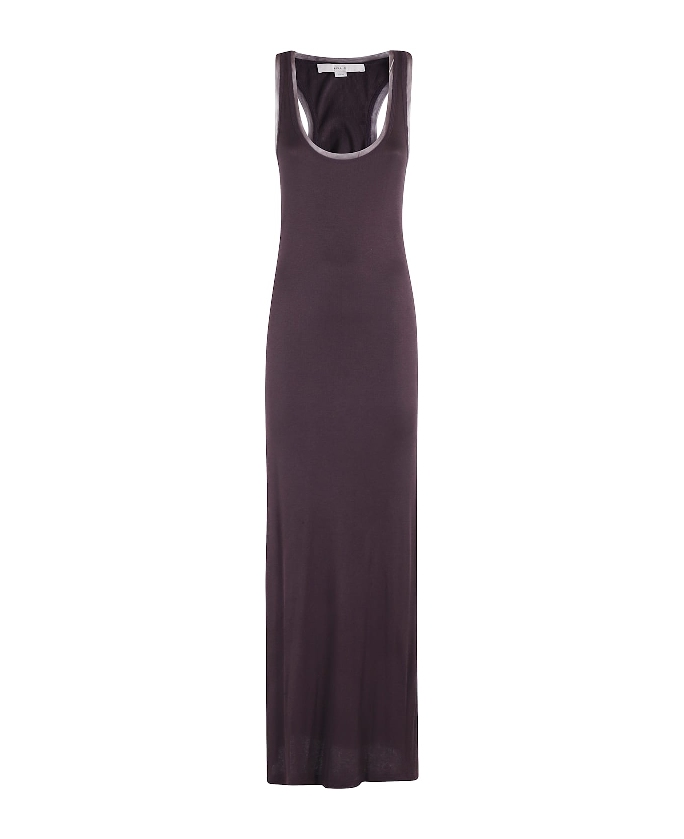 Mesh Trim Dress - Remain - Brown color - Ribbed stretch fabric - Round neckline with mesh insert - Sleeveless - Straight fit - Regular fit