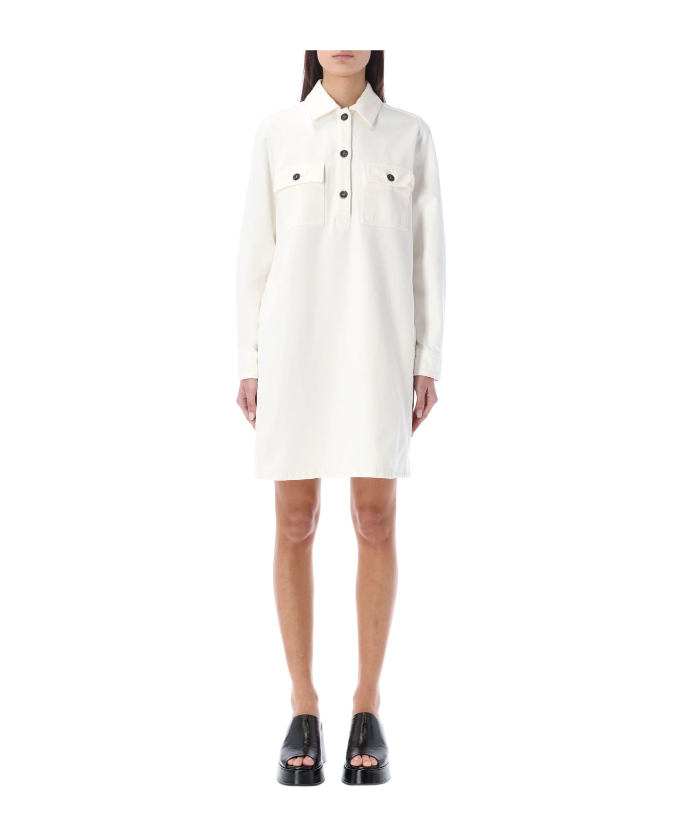 Cotton Mia Denim Mini Dress By A. p. c. Featuring: Straight Cut Mid-thigh Length Classic Collar Three Contrasting Buttons Chest Pockets With Buttoned Flaps Long Sleeves With Buttoned Cuffs Straight Hem Model Is 1,72 M Tall And She Is Wearing Size 36