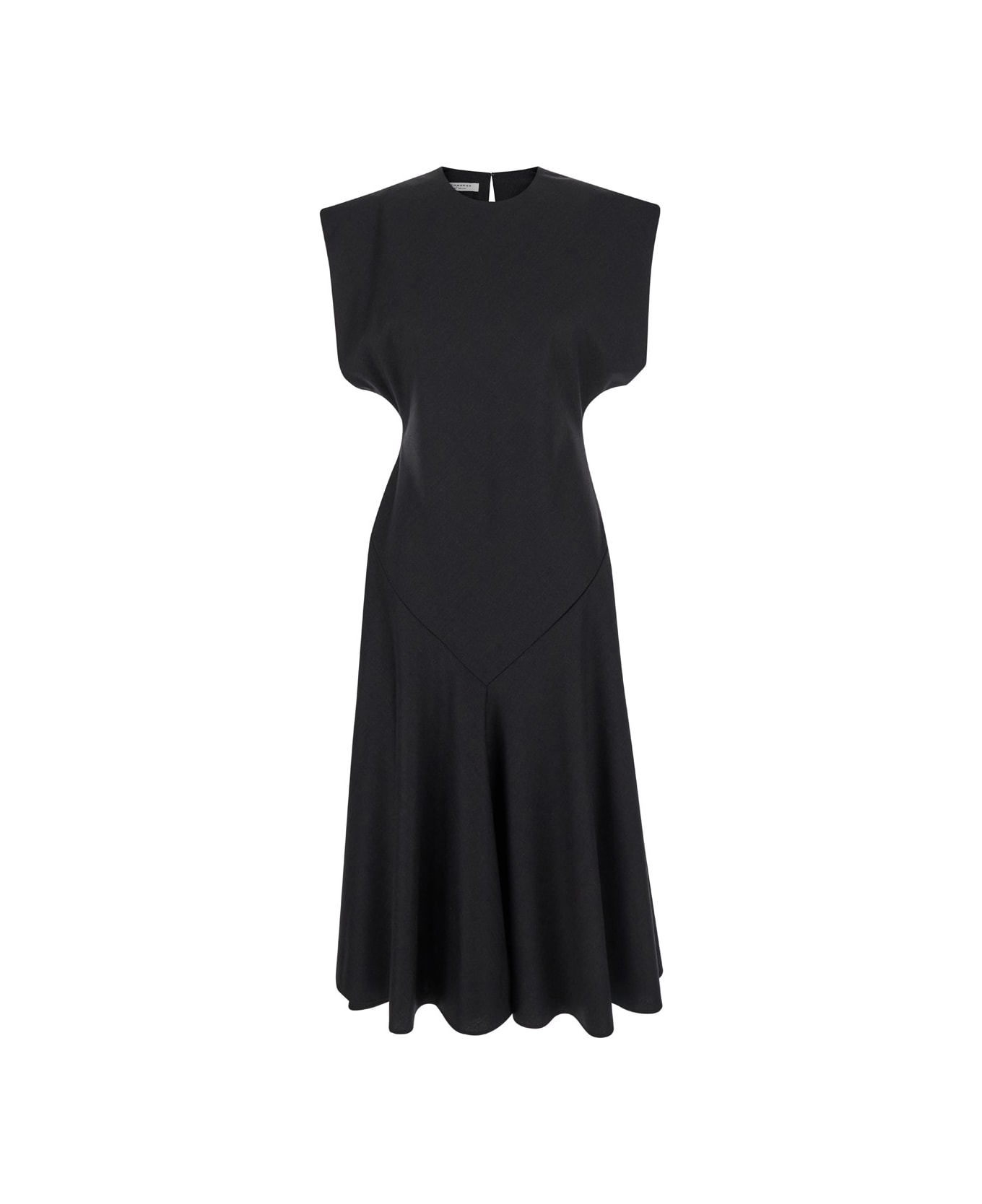 Midi dress Black Crewneck Short dolman sleeves Rear button closure Cut-out at the back Relaxed skirt Tonal stitching Wool blend Relaxed fit