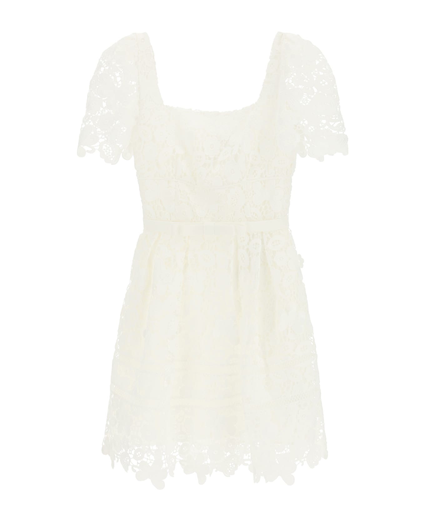 Self-Portrait floral guipure lace mini dress. It features a double square neckline, short sleeves, a fitted bodice and a full skirt. Removable stretch grosgrain belt with front bow, back zip and hook closure, side inseam pockets. Lined interior. The model is 177 cm tall and wears a size UK 8.