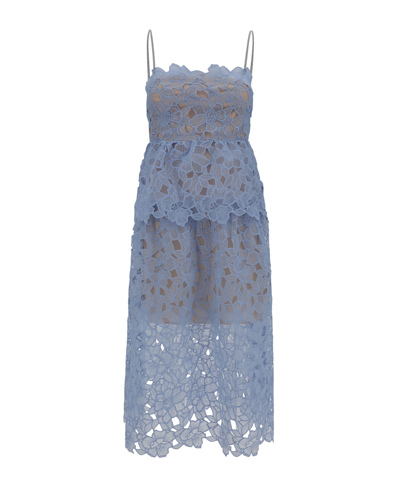 Midi dress by self-portrait, sleeveless design, thin straps embellished with shiny jewels, closure by hooks in side panel, monochrome floral lace pattern with openwork details, dress features opaque petticoat, regular fit.