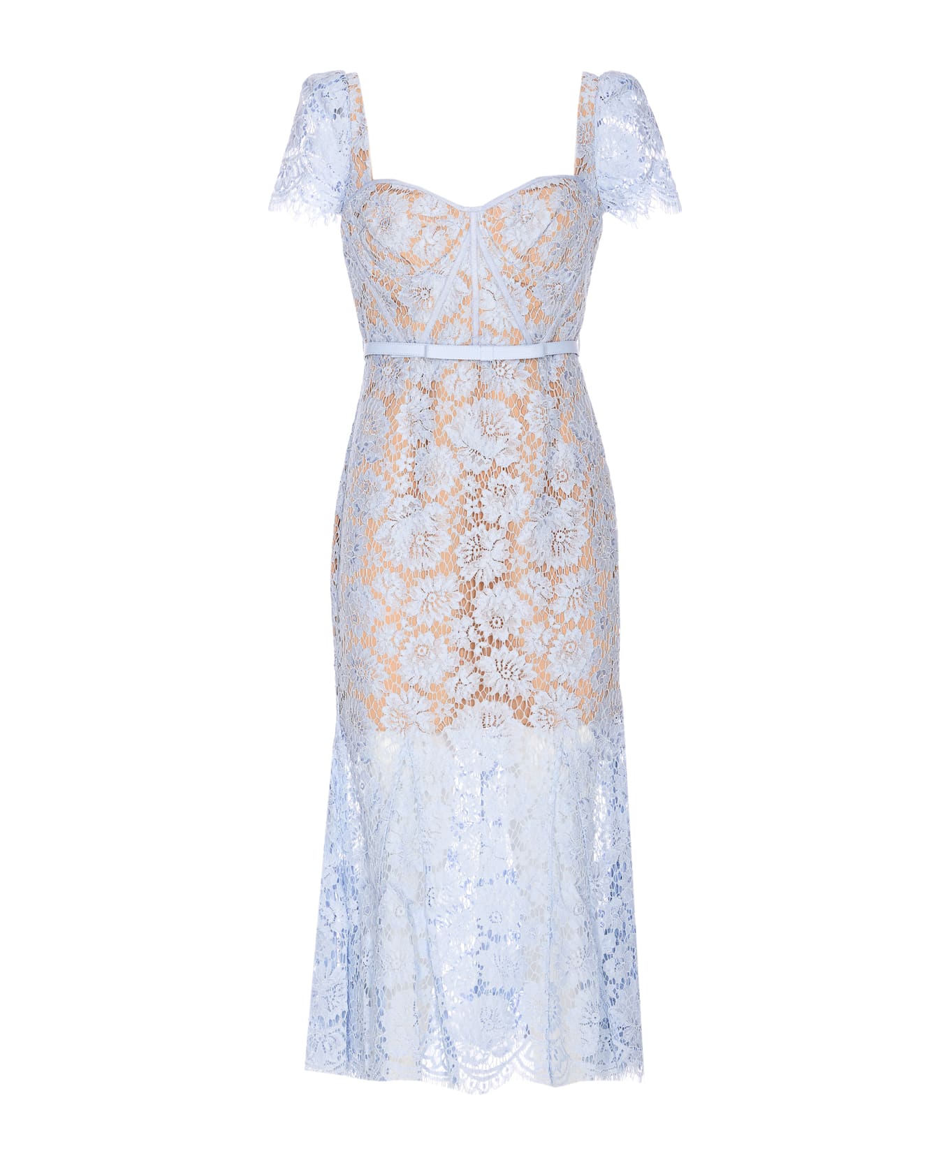 Self Portrait blue midi lace dress, zip and hook closure on the back, petticoat, heart neck, belt on waist, midi model Composition: 63% Polyamide, 27% Cotton, 10% Viscose