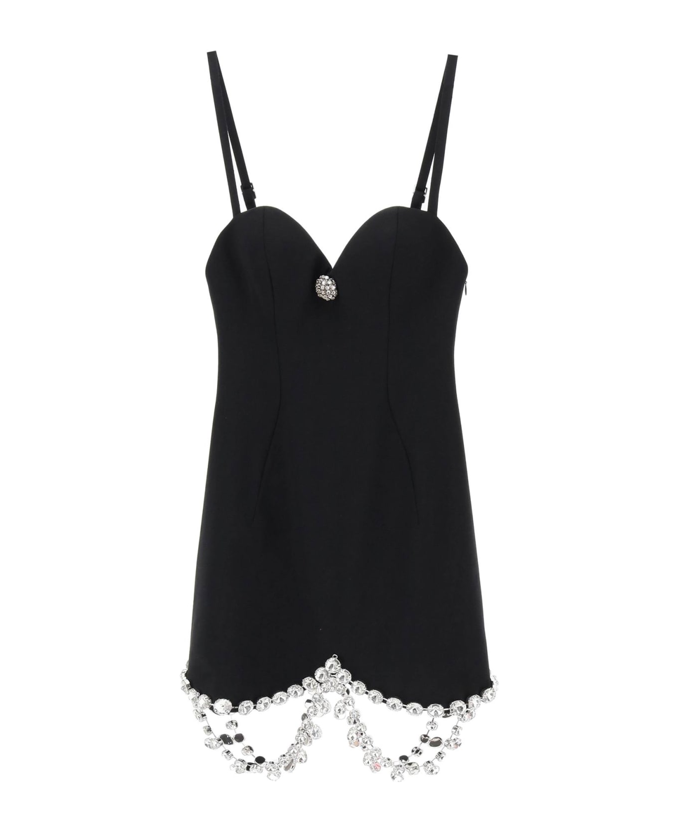 Area mini bustier dress crafted in lightweight wool. Model characterized by rounded asymmetrical hem edged with cascading crystals featuring adjustable straps, sweetheart neckline with molded cups, inner underwire, boned inner seams and side invisible zipper and hook closure. Decorated with crystal applique at bust. Lined interior. Waisted fit. The model is 177 cm tall and wears size US 4.