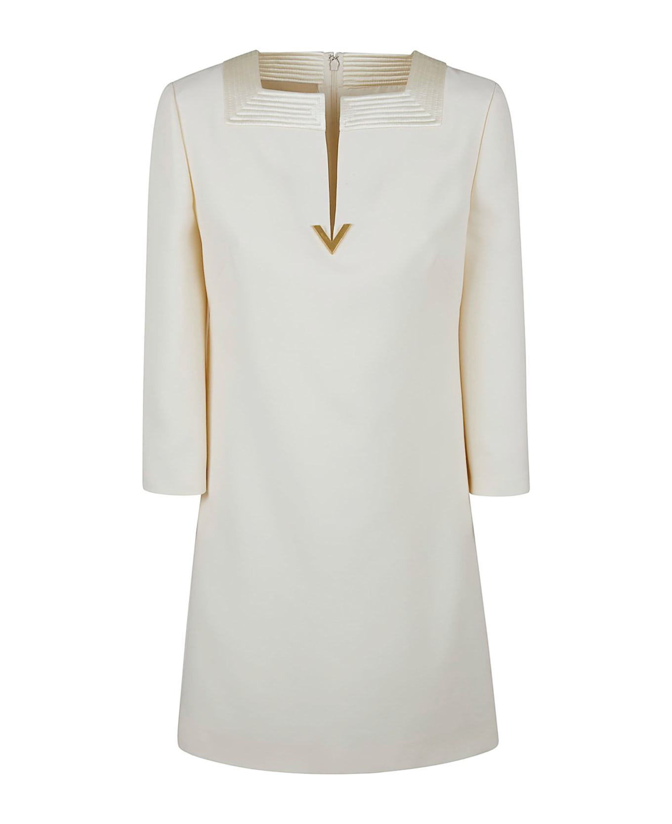 Wool and silk blend dress by VALENTINO GARAVANI. Square and V-neckline; zip and hook closure; long sleeves. Featuring an embroidered collar and gold V.