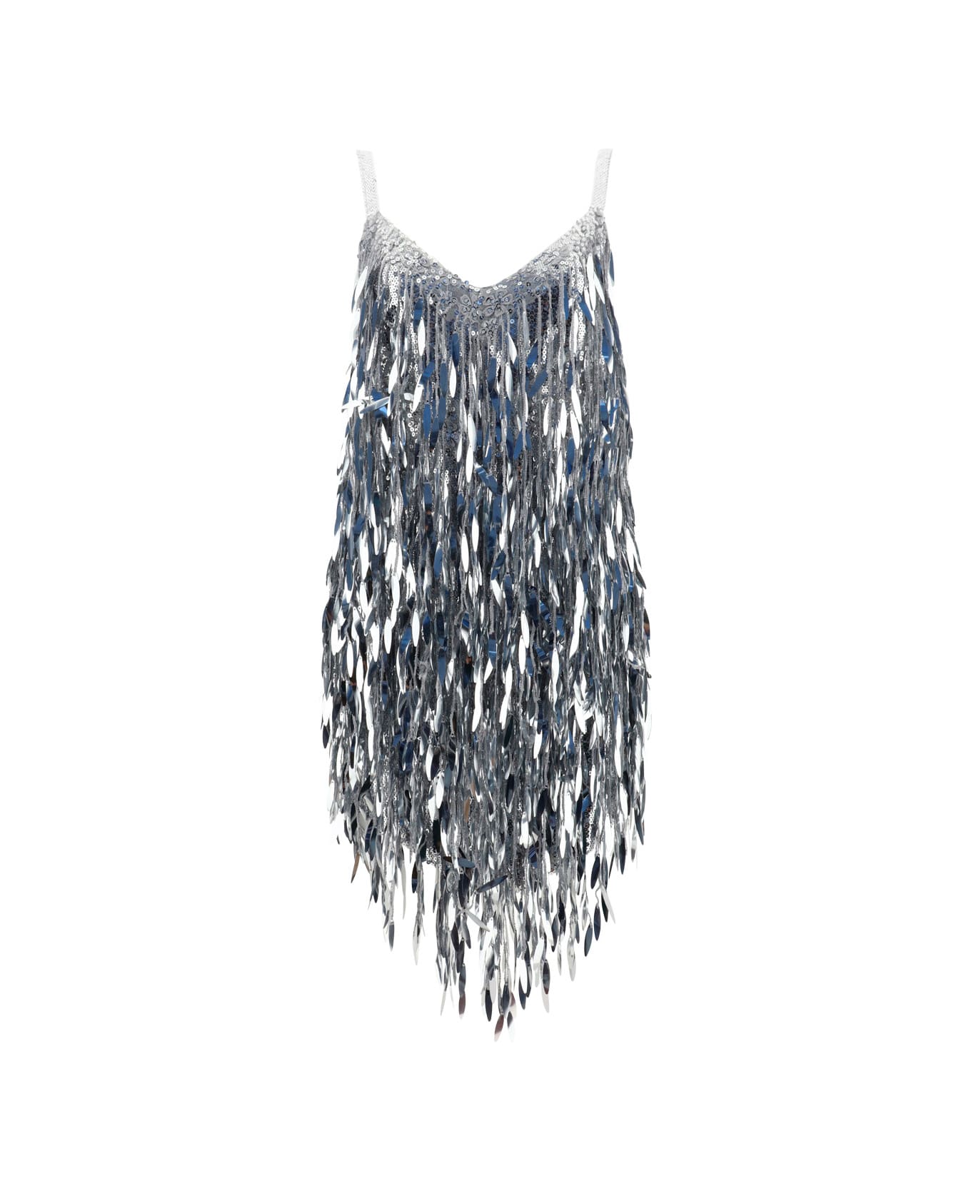 Mini dress by new arrivals, thin shoulder straps, invisible back zipper closure, asymmetrical pointed hem, open back, all-over shimmering sequin appliqué embossed.