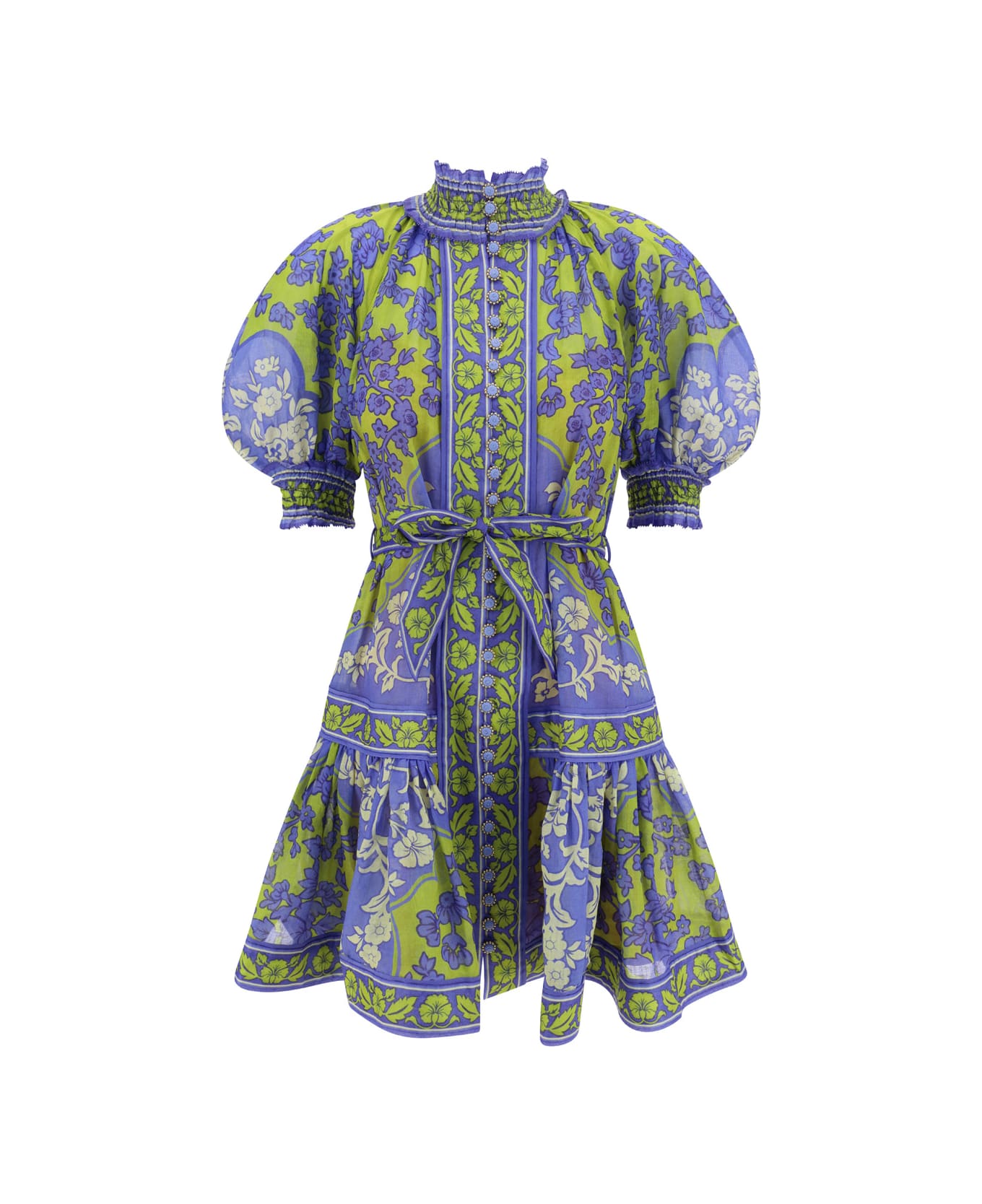 Rami ini lantern dress by zimmermann, mandarin collar, front closure with matching embroidered buttons, mini skirt pattern with ruffle hem, all-over printed floral pattern design, elasticated puff sleeves, matching waistband.