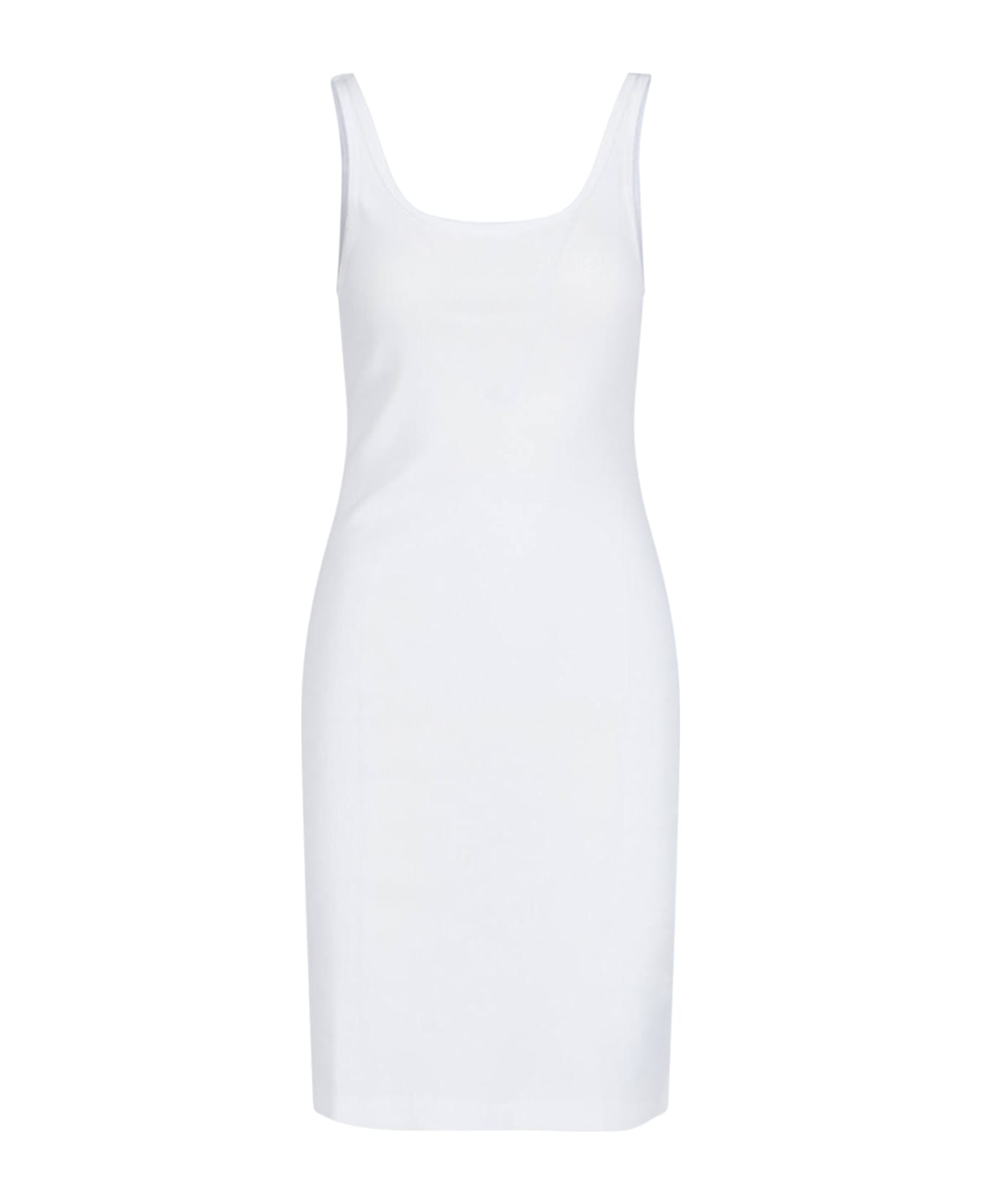 Maison Margiela MM6 white cotton mini dress with ribbed pattern, round neckline, sleeveless, thin straps, one-shoulder convertible detail, tone-on-tone "Numeric" logo embroidery, central back slit, straight hem.