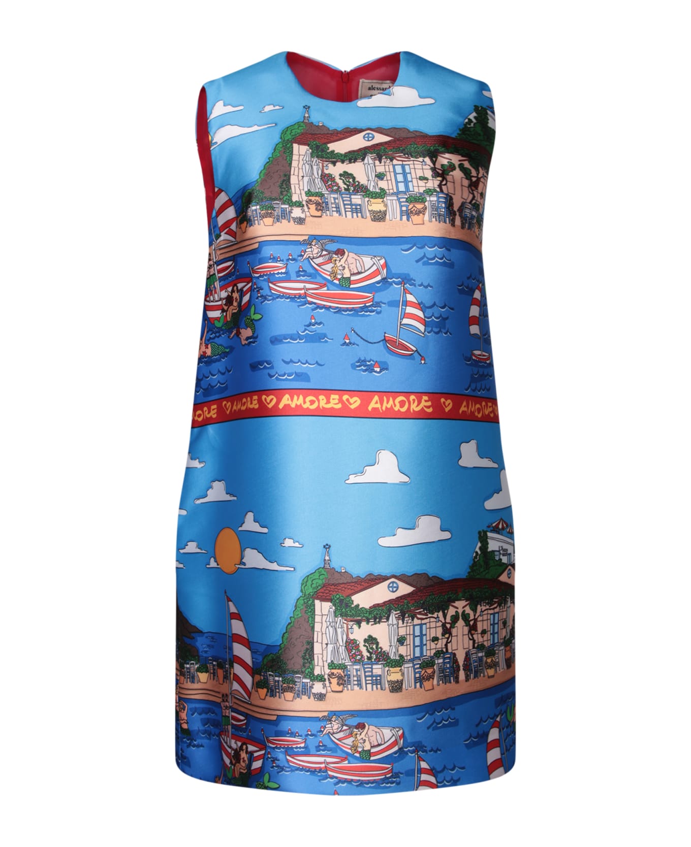 This mini trapeze dress by Alessandro Enriquez captures the summer spirit with its lively print inspired by Italian maritime scenes, perfect for a special occasion or a summer stroll.