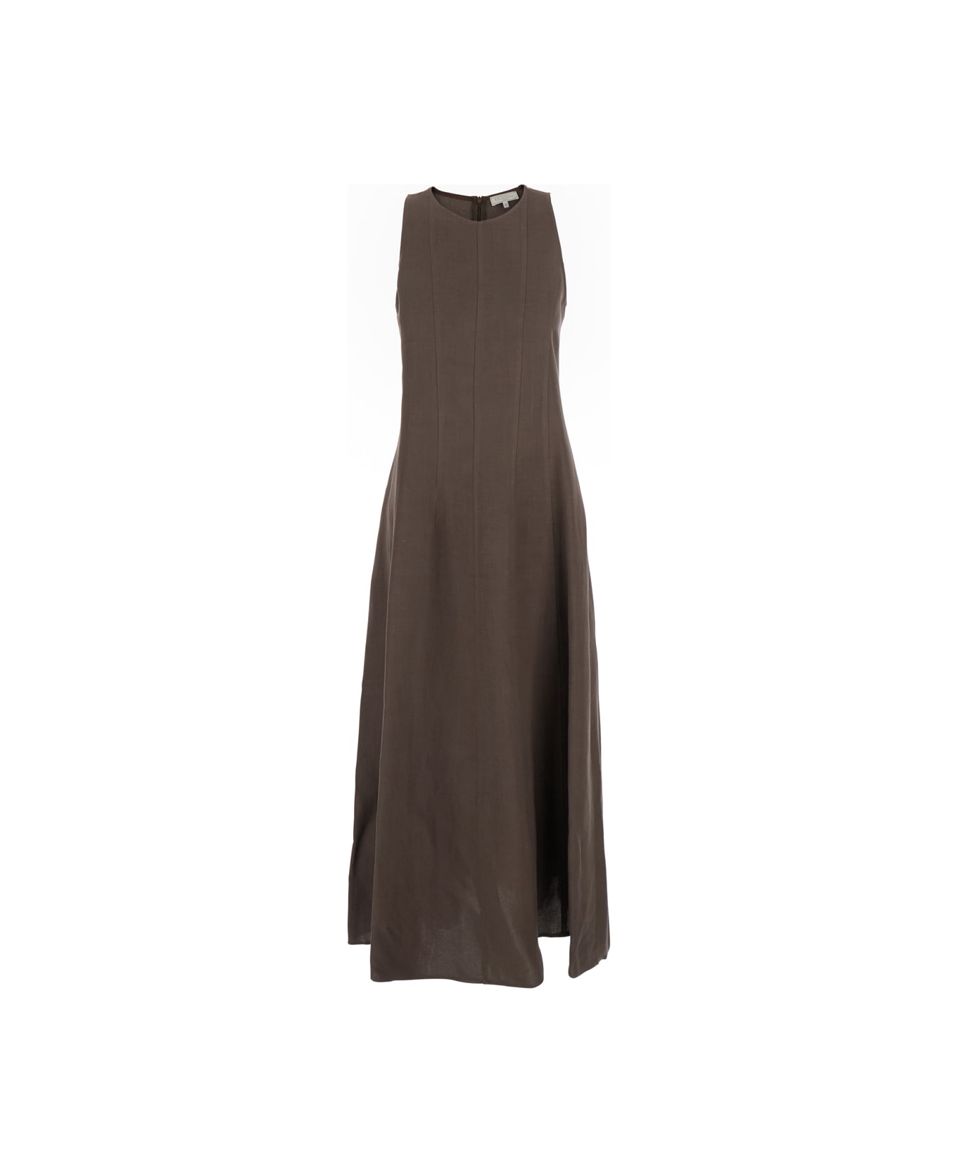 Long dress Brown Crew neck Sleeveless Hidden back closure Two side pockets Straight hem Viscose and linen blend Loose fit
