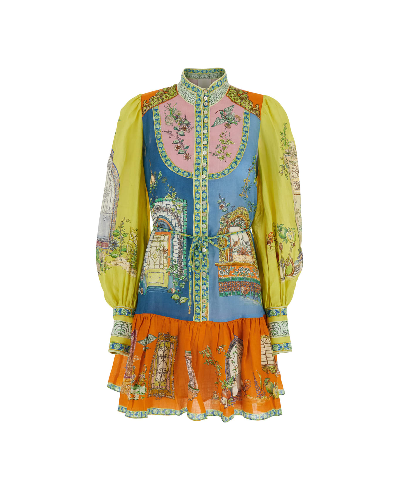 Dress Multicolor Color block inserts All over graphic print Stand collar Long balloon sleeves Button closure on the front Adjustable and removable waist belt Buttoned cuffs Ramia Loose fit