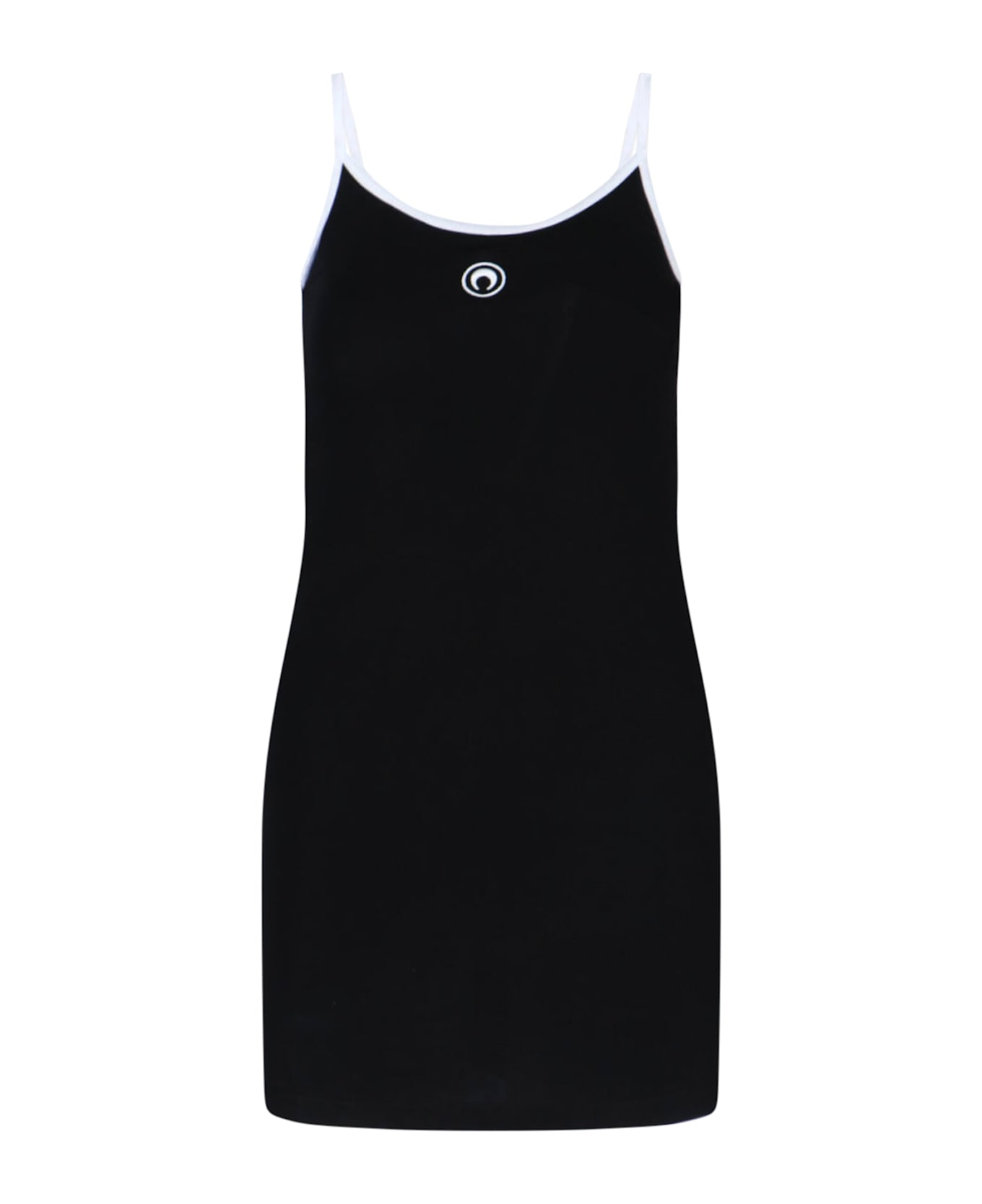 Marine Serre 'Moon' logo mini dress in black cotton with contrast trims, sheath design, ribbed workmanship, round neckline, sleeveless, thin straps, contrasting chest logo embroidery, logo label at the back, straight hem. Composition: 100% Cotton