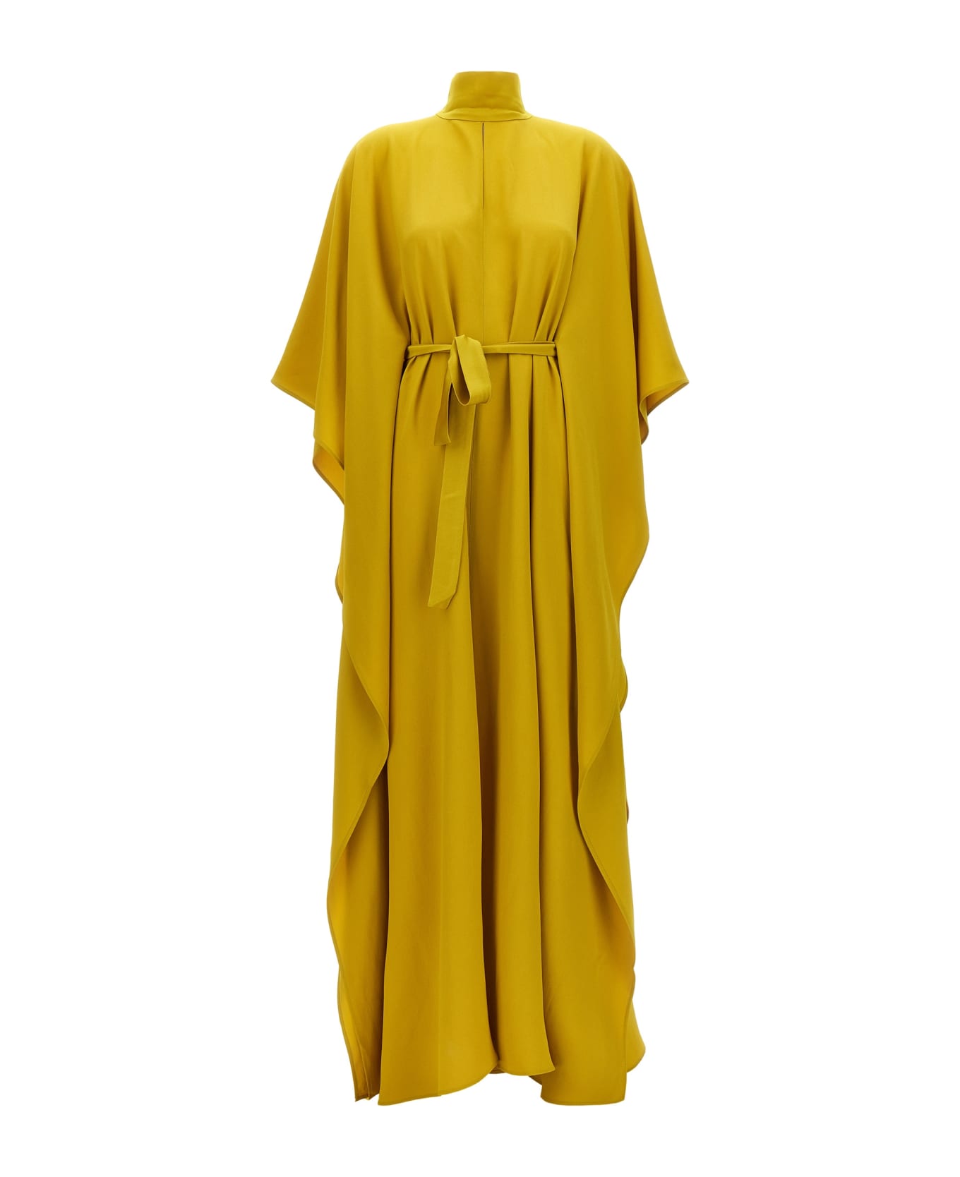 Mrs Hall dress with open back, high neck, belt to tie at waist, and wide sleeve.