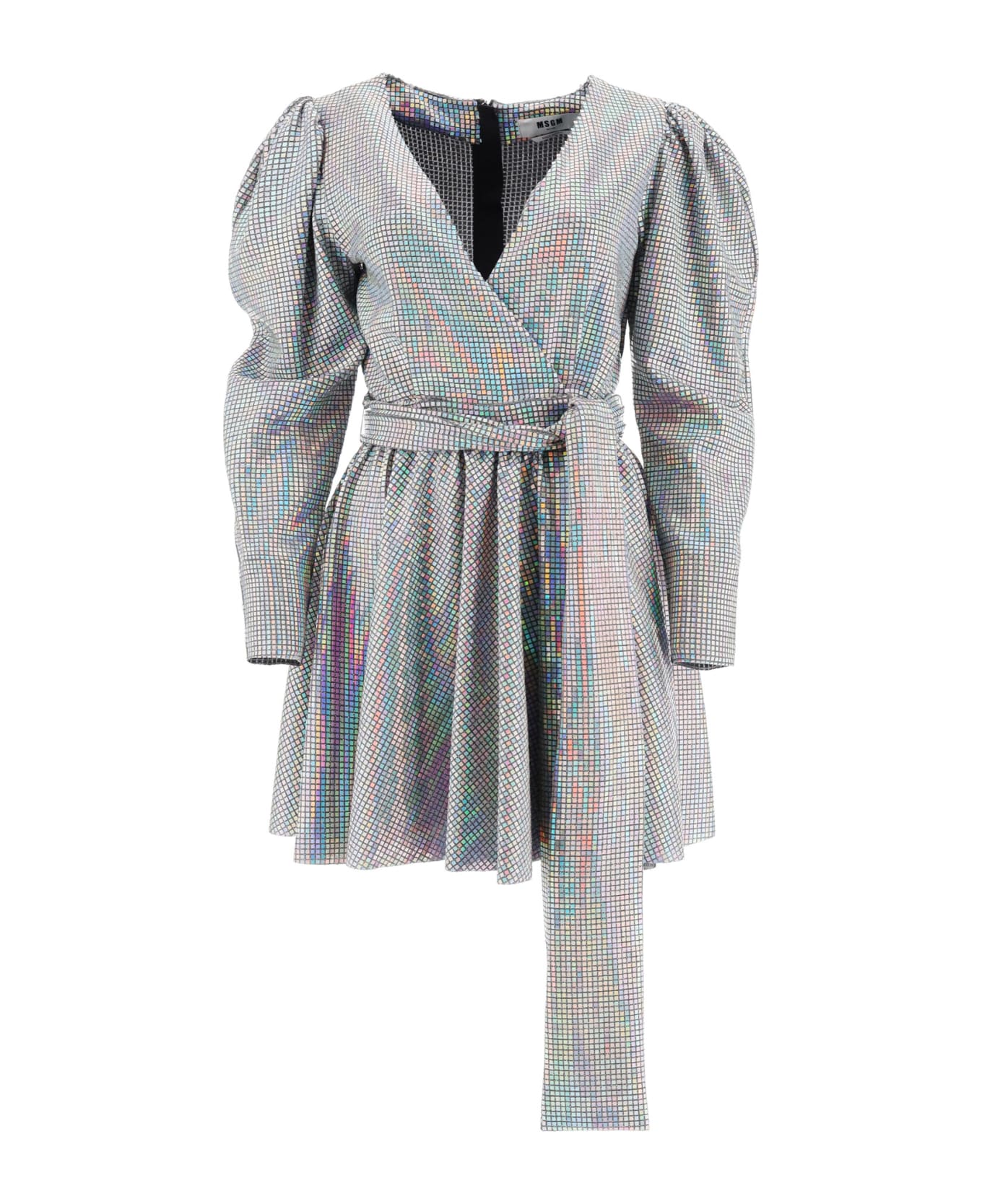 MSGM minidress made of laminated fabric with iridescent "disco" effect facets. It features a wrap top, voluminous balloon sleeves and a waistline highlighted by a sash belt. Flared hem and back invisible zip closure. The model is 177 cm tall and wears a size IT 38.