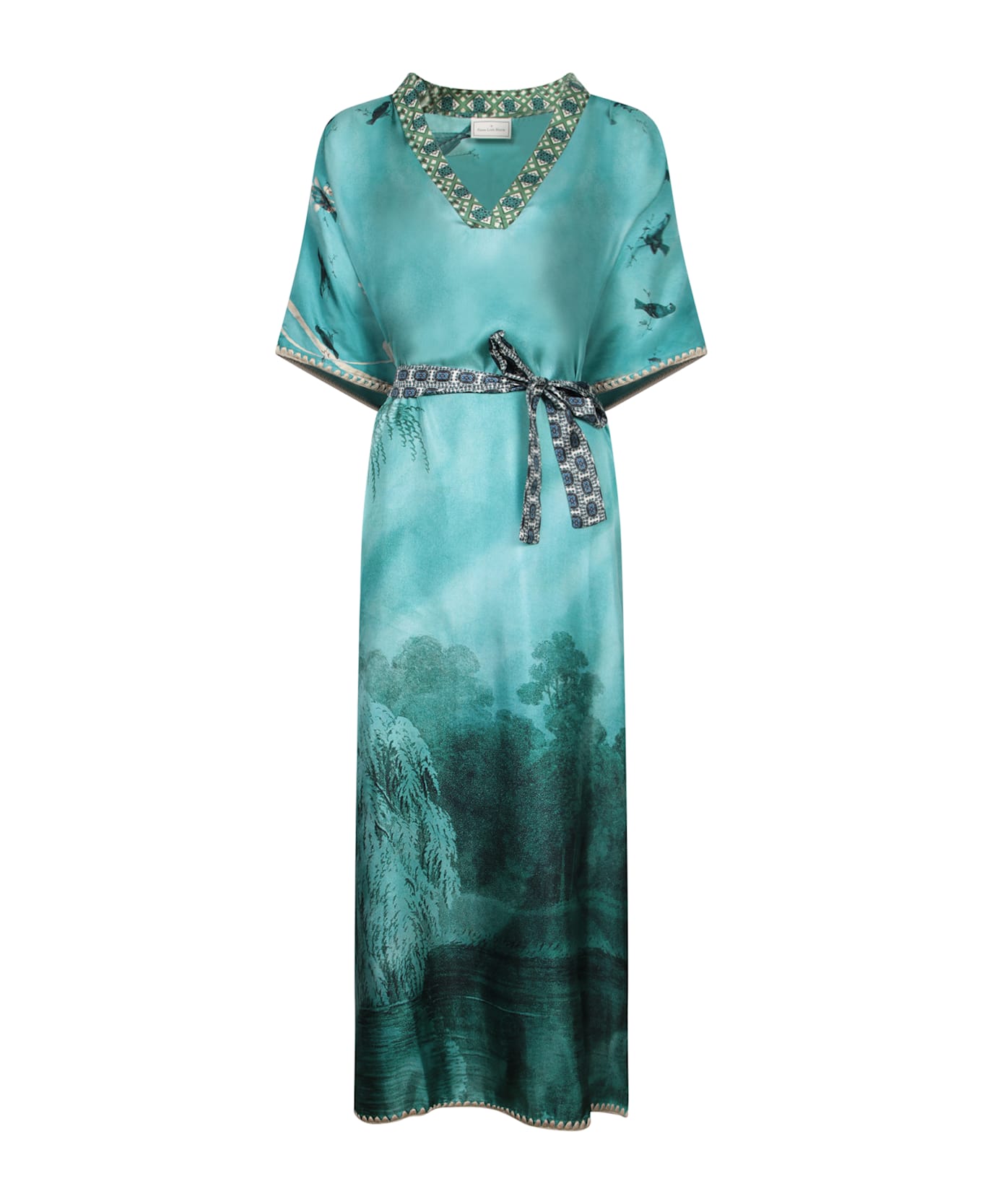 This elegant kaftan features a vibrant forest print in shades of blue and green, enhanced by a stylish trim along the neckline and sleeves, and a fabric belt that highlights the silhouette.