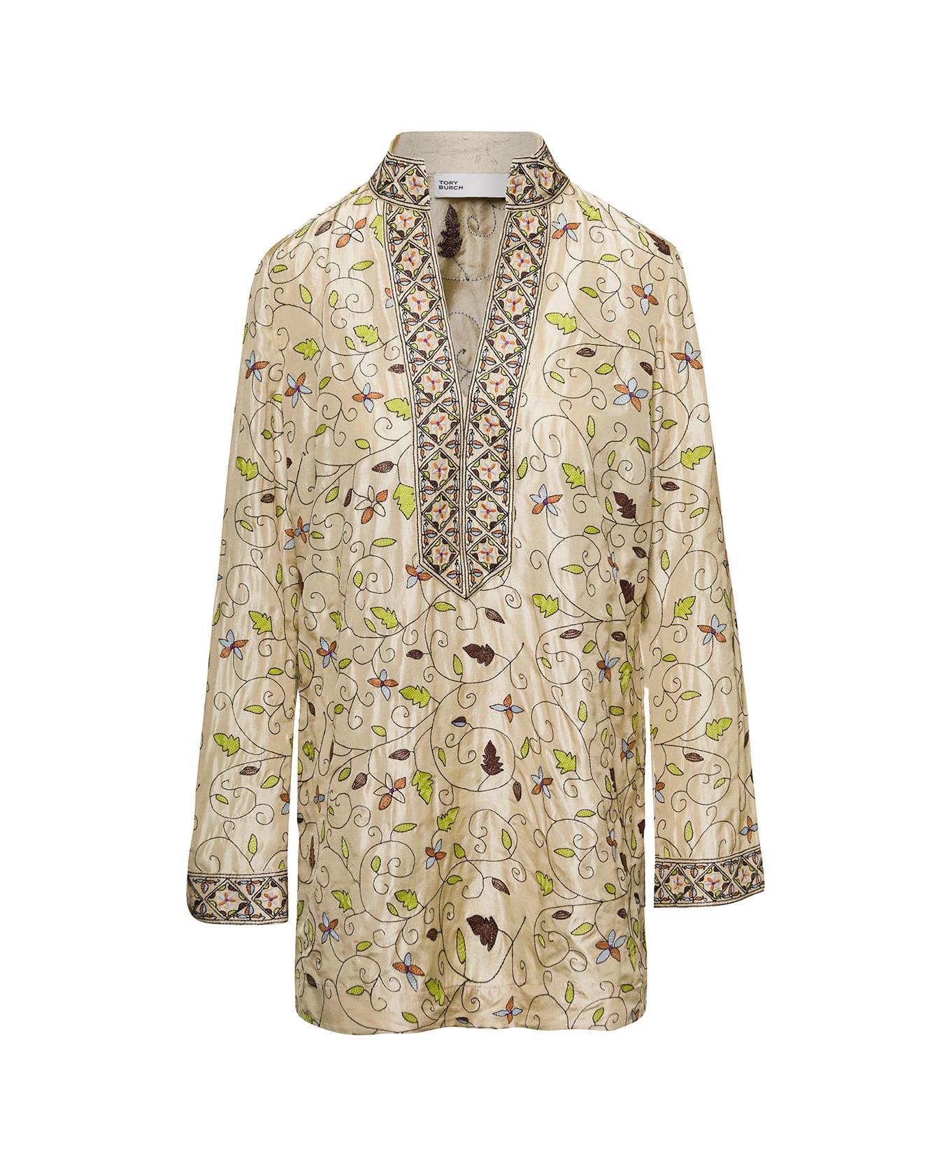 Multicolor Embroidered Leaf-print Tunic In Silk Woman