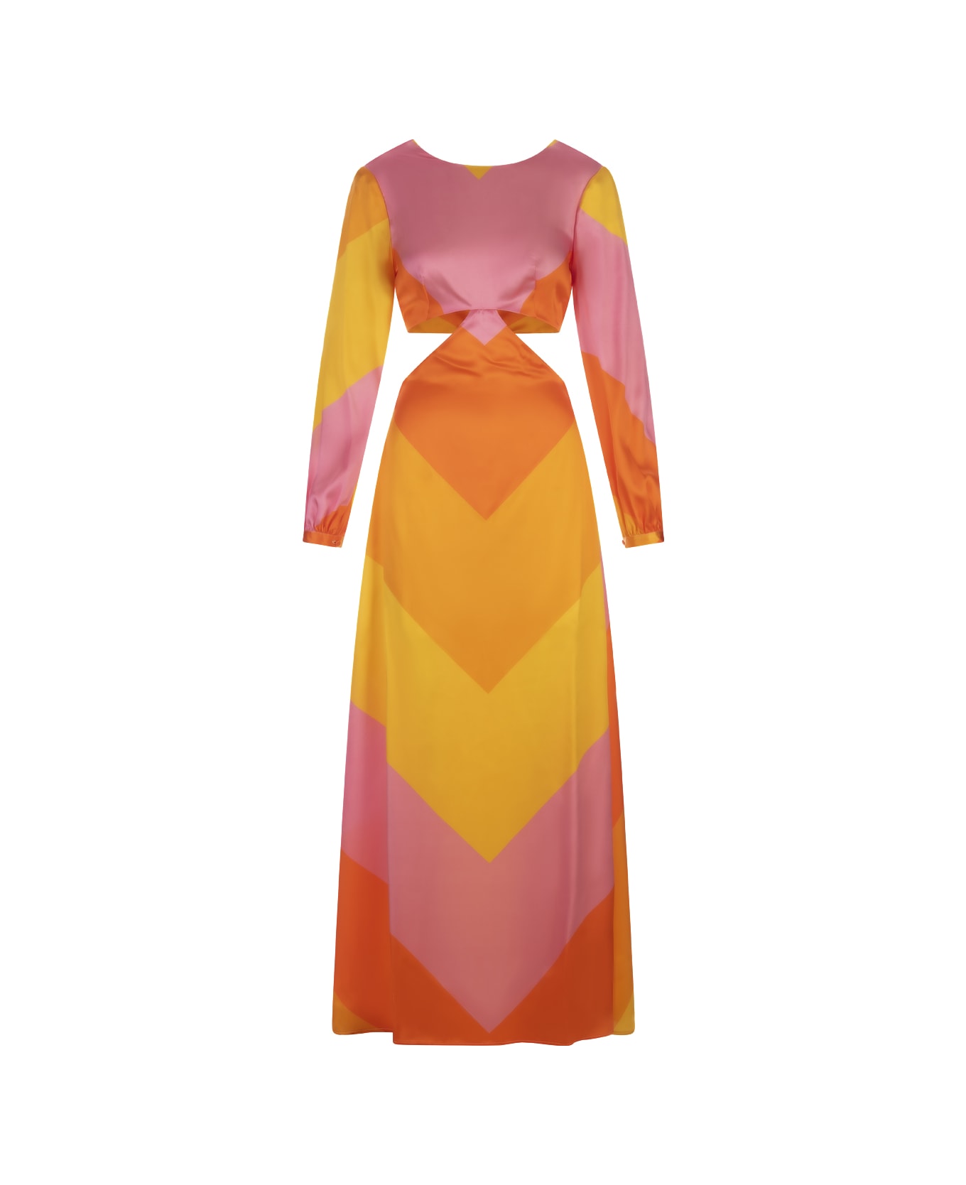 Fiona long dress by Raquel Diniz in silk with a multicoloured geometric-inspired print. The details include: a cut-out design to the sides, a round neckline, long sleeves, a flared skirt and a back zip fastening.