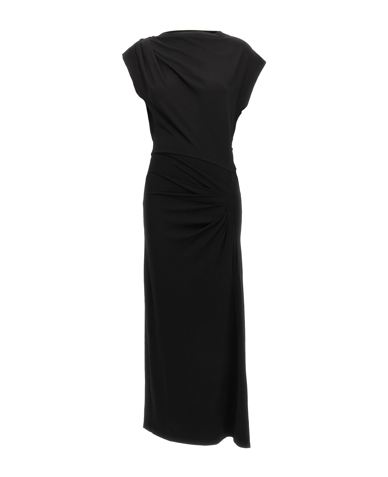 'Naerys' dress in stretch viscose with soft, sleeveless neckline, draping detail.