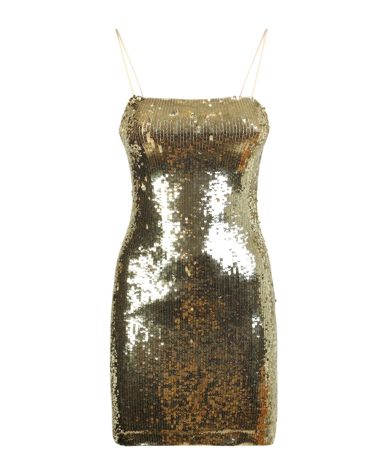 Sequined design. Cut-out detailing. Square neck. Rear zip fastening. Spaghetti straps. Thigh-length. Straight hem. Color: gold