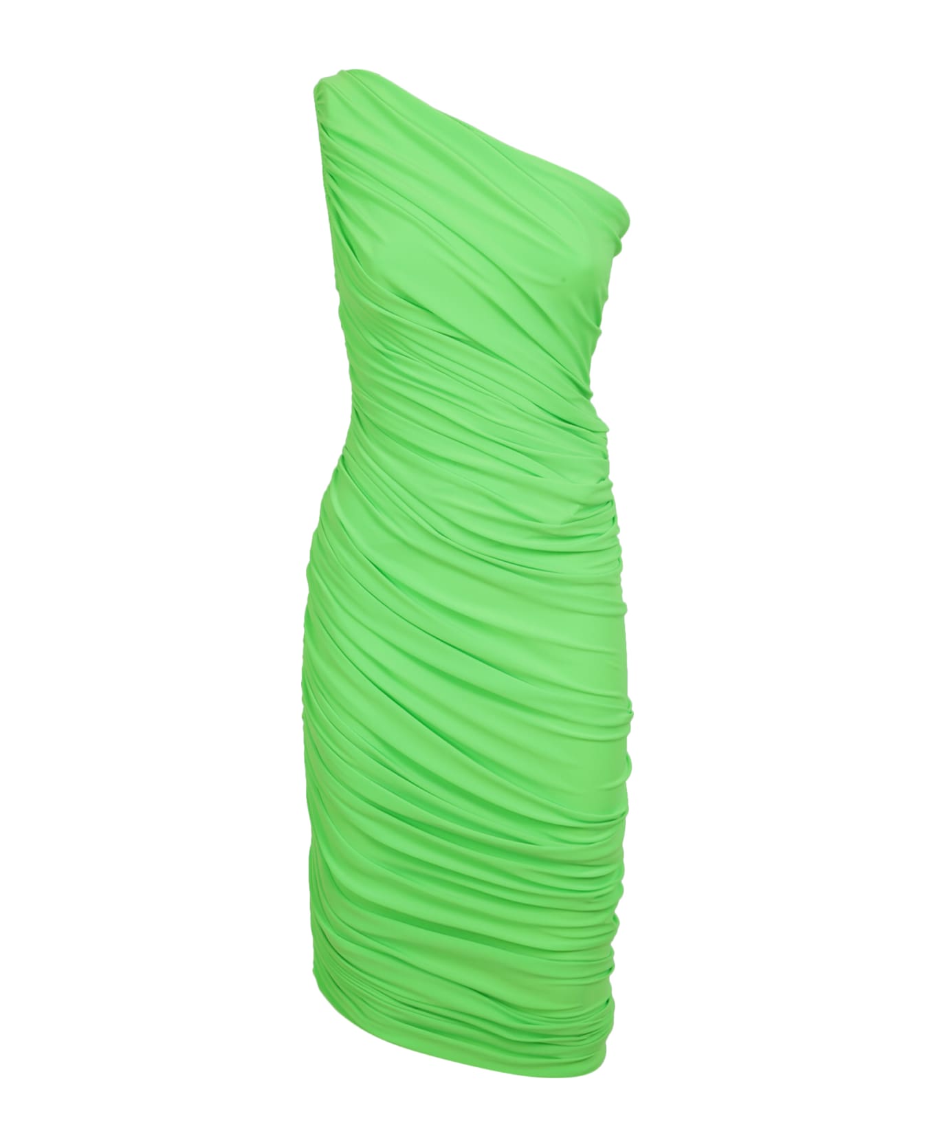 One shoulder. Knee length. Asymmetrical hem. Color: Neon green
