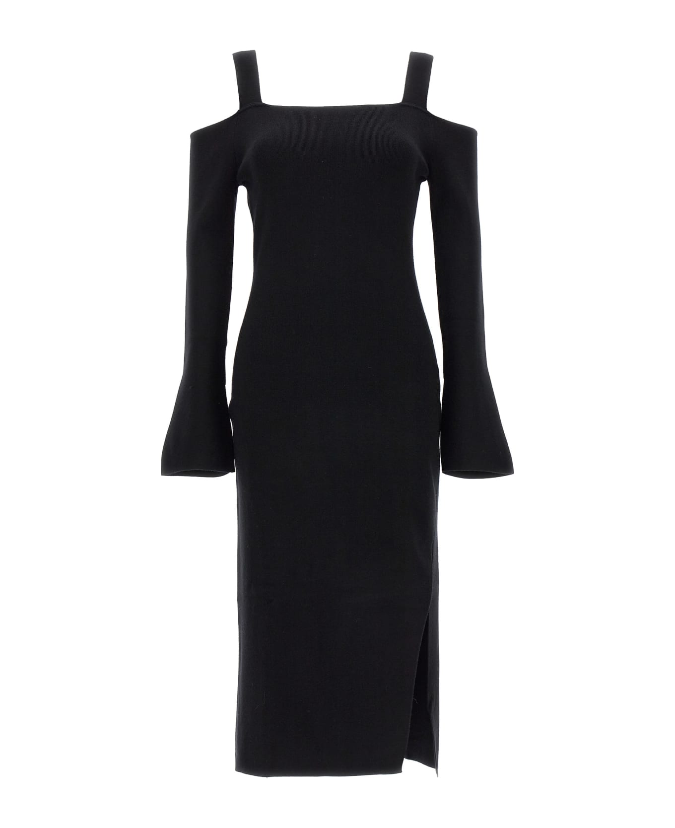 Viscose blend knit dress with off-the-shoulder style with shoulder straps and long sleeves and a side split on the bottom of the garment.