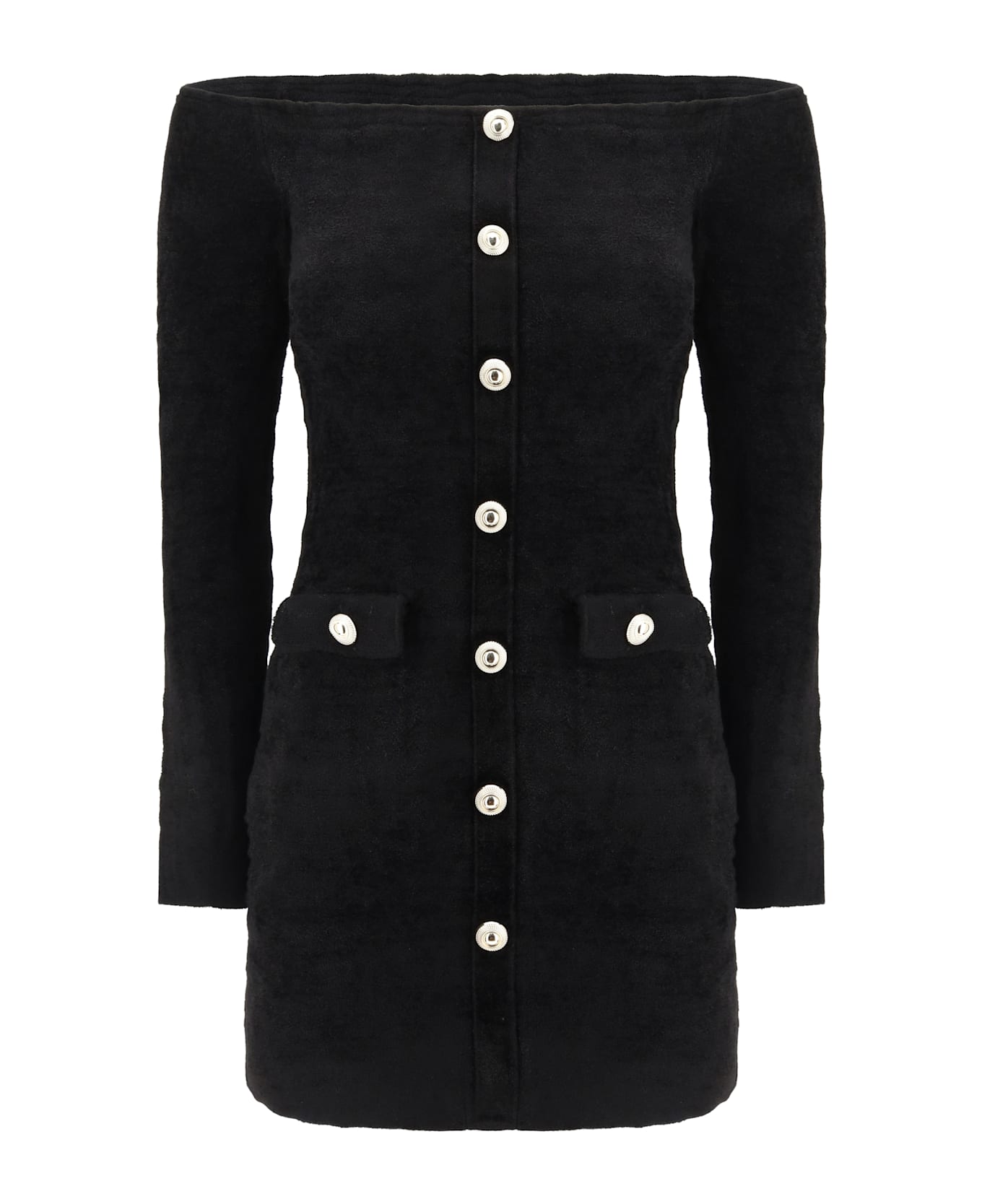 Self-portrait's mini dress is a sophisticated and modern piece featuring off-the-shoulder and long sleeves, giving it an elegant and sensual contrast. the stretchy design ensures a snug and comfortable fit, while jewel-applied buttons on the front add a touch of luxury and sophistication. the two slit pockets with patch flap on the front complete the look with a practical yet stylish detail.