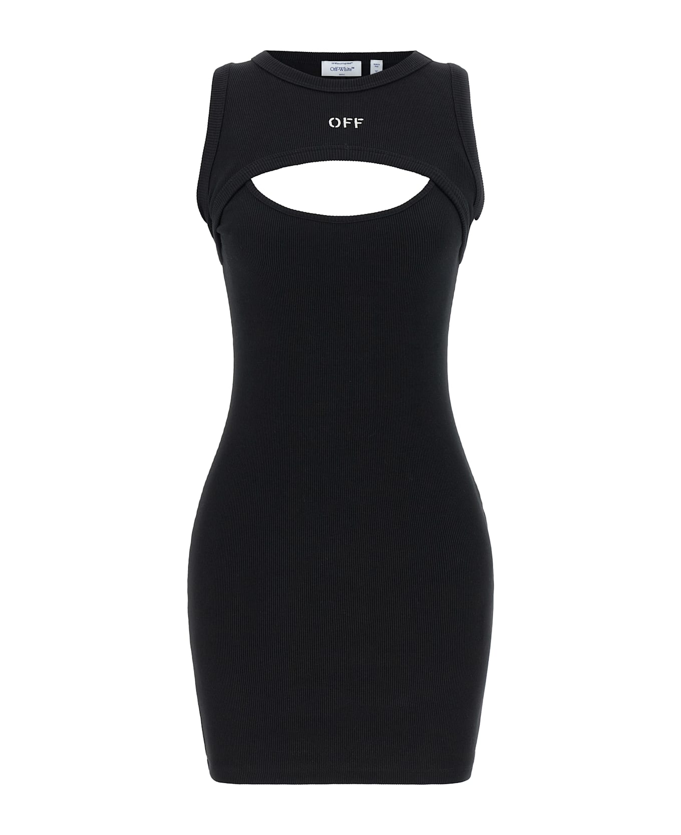 'Off Stamp' ribbed stretch cotton mini dress with double layer upper part with crew neck insert with contrasting logo embroidery, thin straps, sleeveless, round neckline.