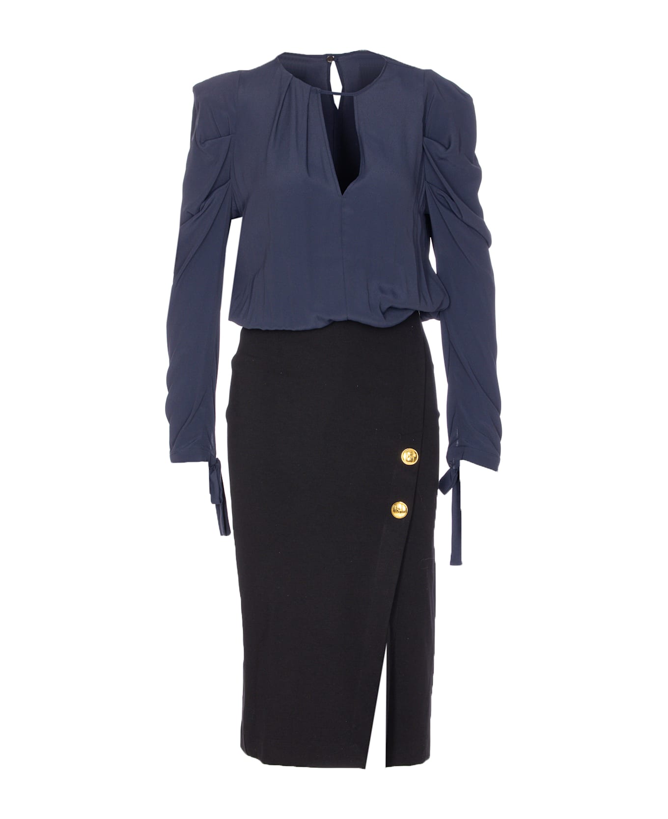 Pinko blue and black Omelette dress, button closure on the back, V-neck, long sleeves, bow on cuffs, logo button details, midi model Composition: 67% Viscose, 28% Nylon, 5% Elastane