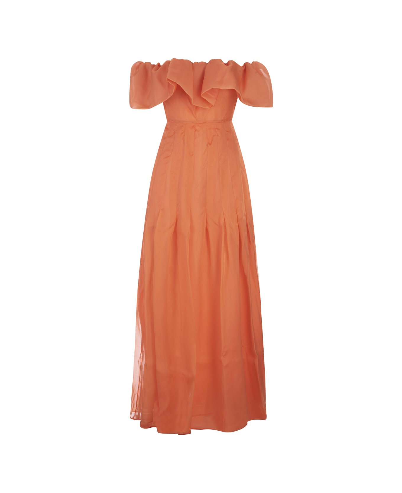 Julles long dress by Raquel Diniz in orange silk chiffon. It features open shoulders, short sleeves, a flared skirt, a voluminous ruffle at the neckline and a practical concealed zip fastening at the back.