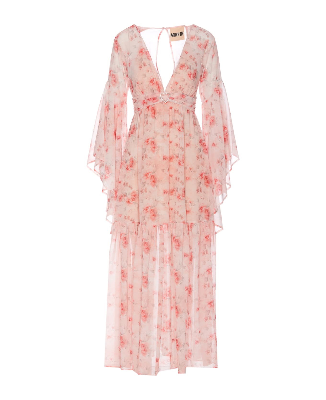 Aniye By pink long dress, V-neck, zip closure on the back, floral pink, heart detail on the front, asymmetrical and flared sleeves