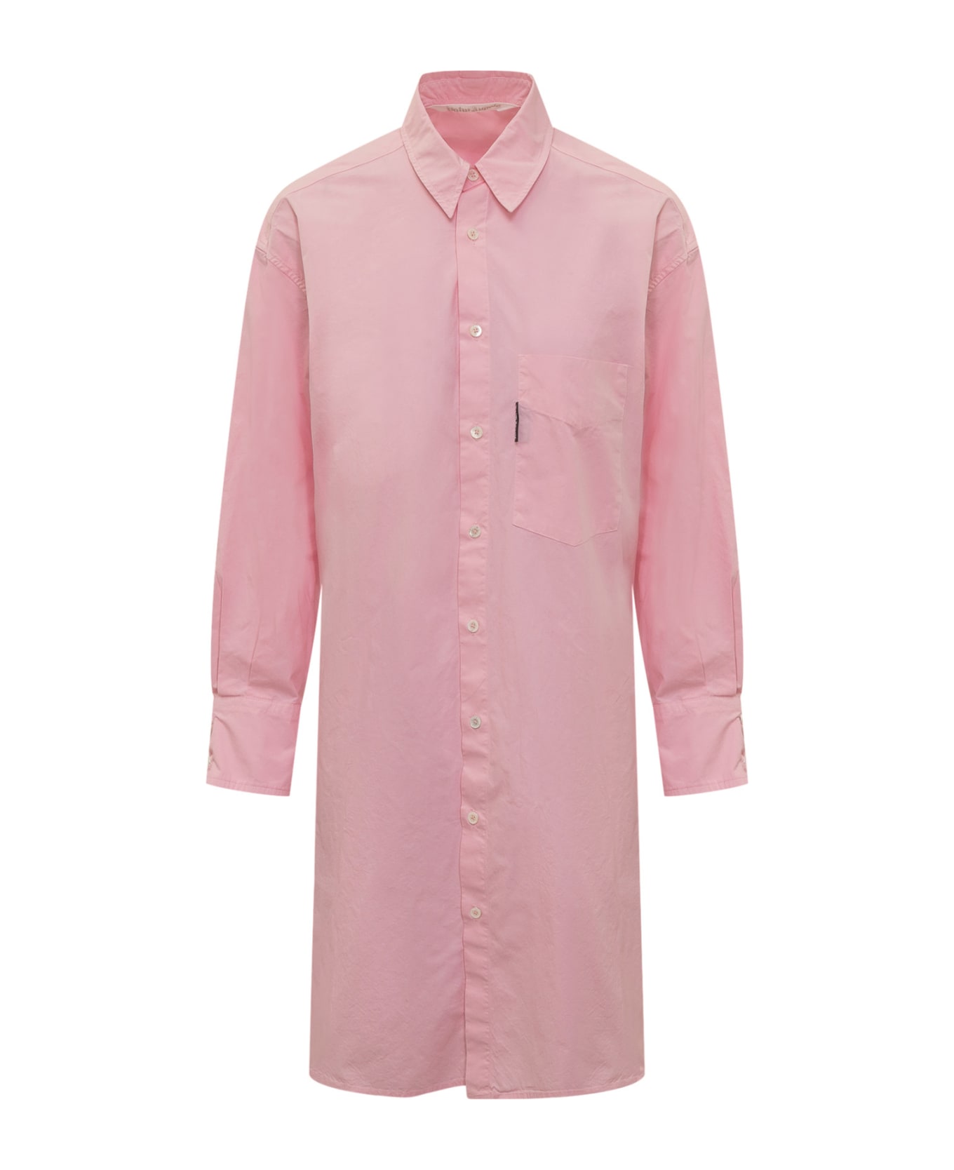 Midi dress with long sleeves. Classic collar. Button closure. Cuffs with buttons. Single pocket on the front. Logo tab on the pocket and maxi logo printed on the back. Composition: 100% Cotton