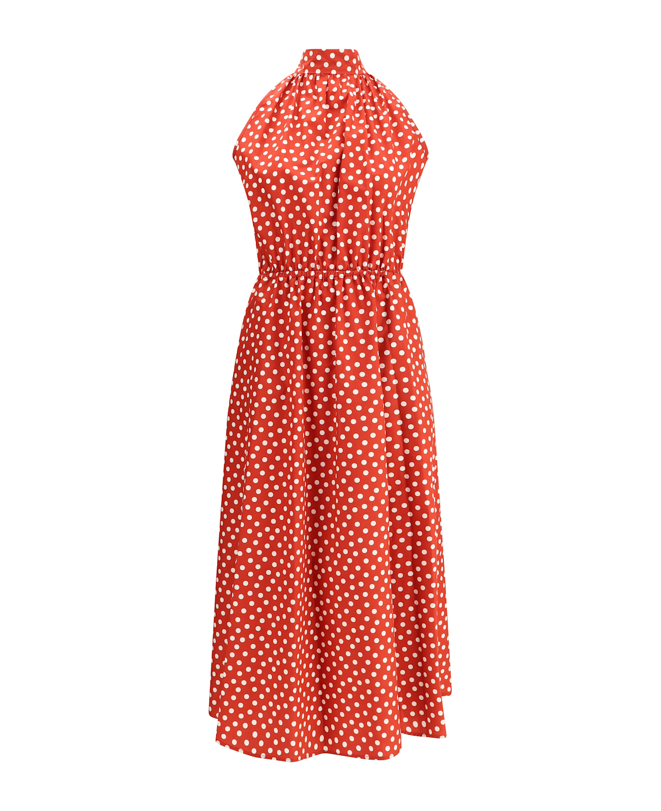 The ovo leather long dress by crida milano is an elegant and sophisticated garment. it features a soft bodice and an american-style ribbon neckline, giving it a refined and sensual look. the lightweight fabric ensures a soft and fluid fit, while the side slit pockets and elastic waist combine essentiality and practicality. the patterned polka dot design adds a touch of originality, making the dress perfect for special occasions or elegant yet comfortable looks.