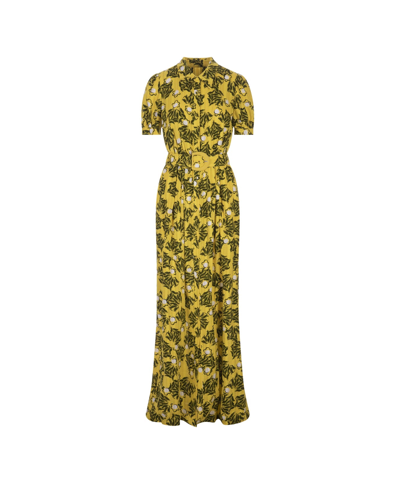 Paddy maxi dress by Diane Von Furstenberg cut from a soft, textured yellow cotton with a contrasting color print. Model features fabric-covered buttons from the V-neck to the ankle hem, short puff sleeves and a classic collar in the style of a shirt dress. It can be cinched at the waist with a matching belt.