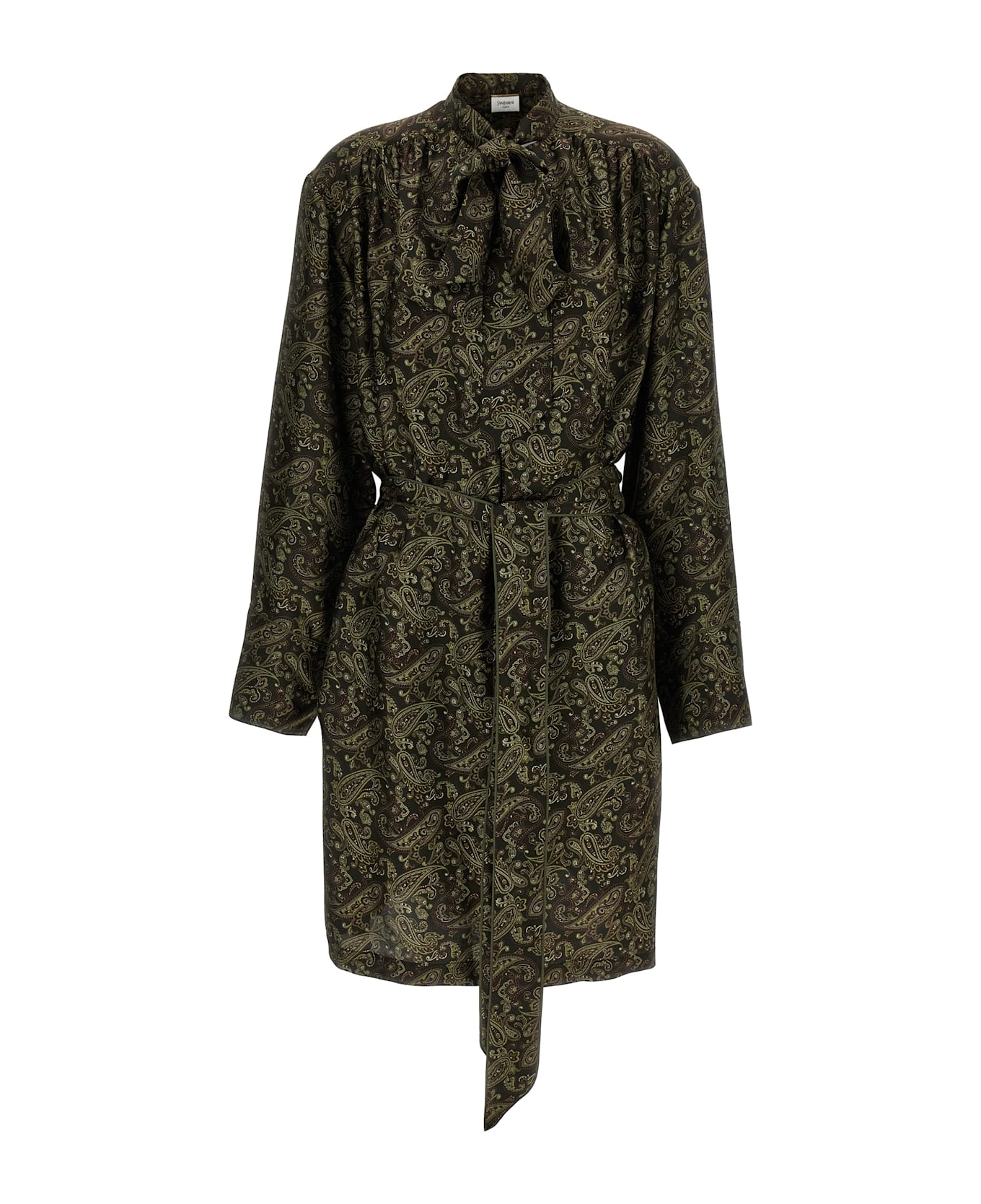 Paisley-print silk twill midi dress, button closure with front teardrop cut-out detail, lavallière collar, long wide sleeves with cuffs and dropped shoulder, wide side slits, and removable belt. Composition: 100% silk
