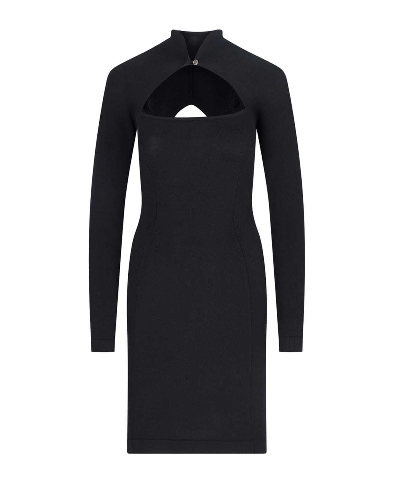 Vivienne Westwood 'Pamela' cut-out mini dress in black virgin wool with high neck, maxi cut-out at the front, cut out at the back, multicolor 'Orb' logo embroidery on the back, straight hem. Composition: 100% Virgin Wool