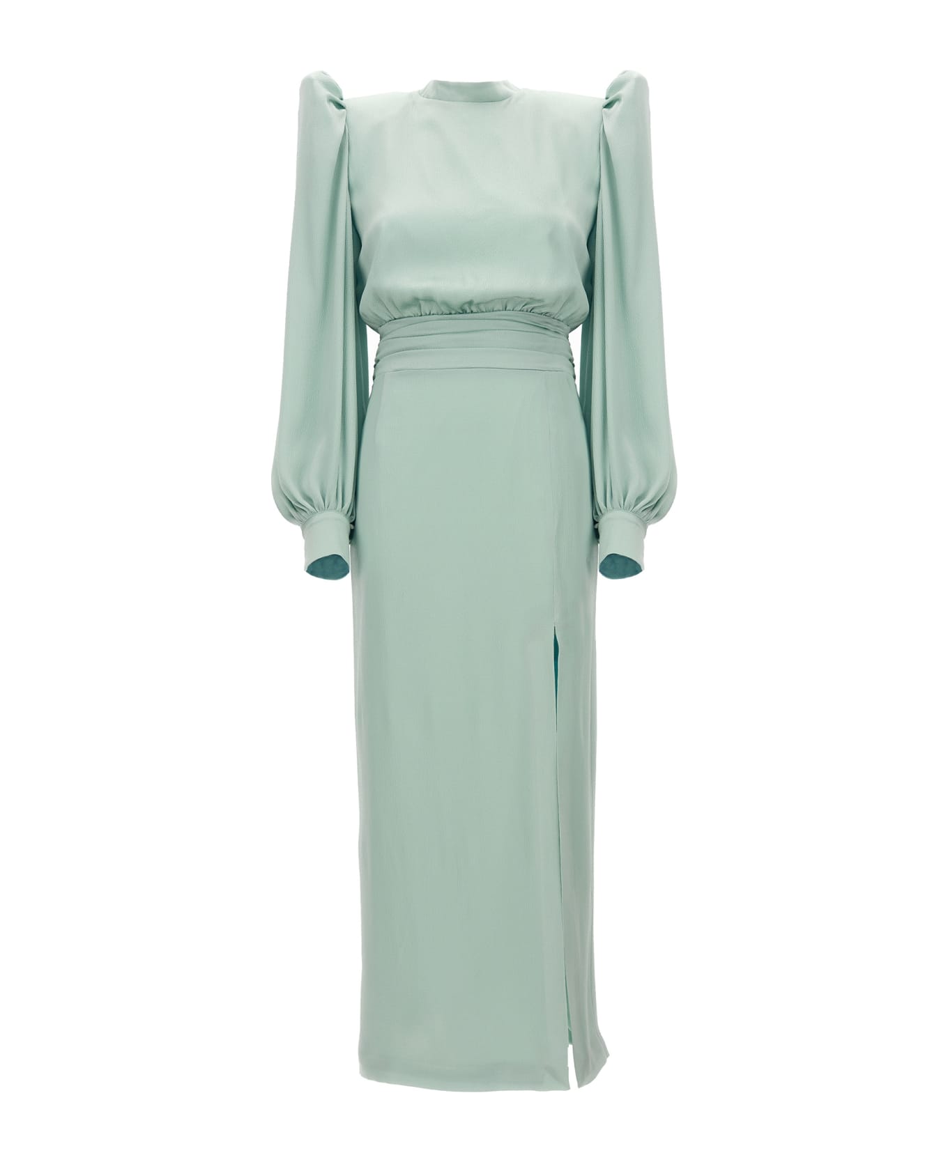 'Paradise' silk satin blend dress with long puff sleeves with cuffs, waist point marked with draping, side split, slit at the back and a concealed side zip.