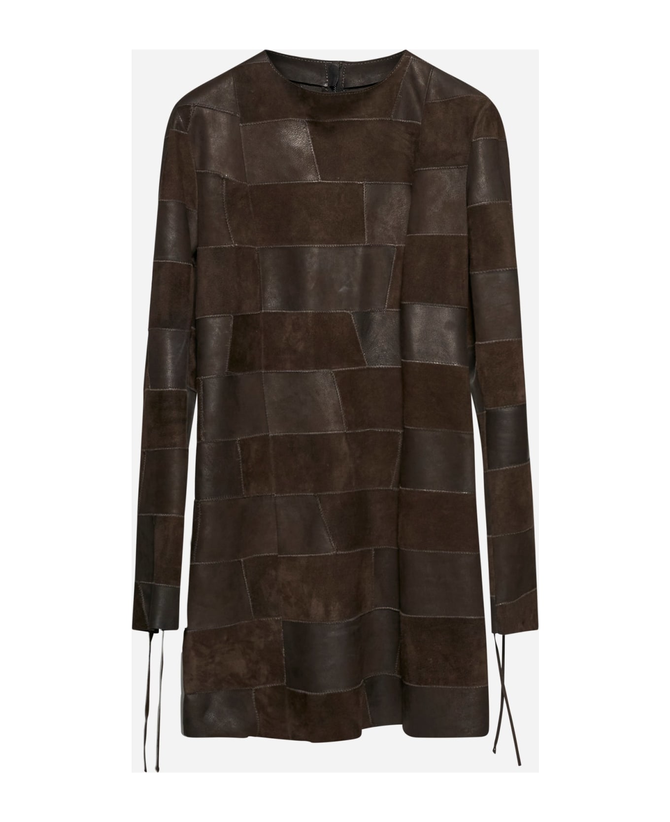 dress in leather and patchwork suede, back opening with zip, side leather woven.