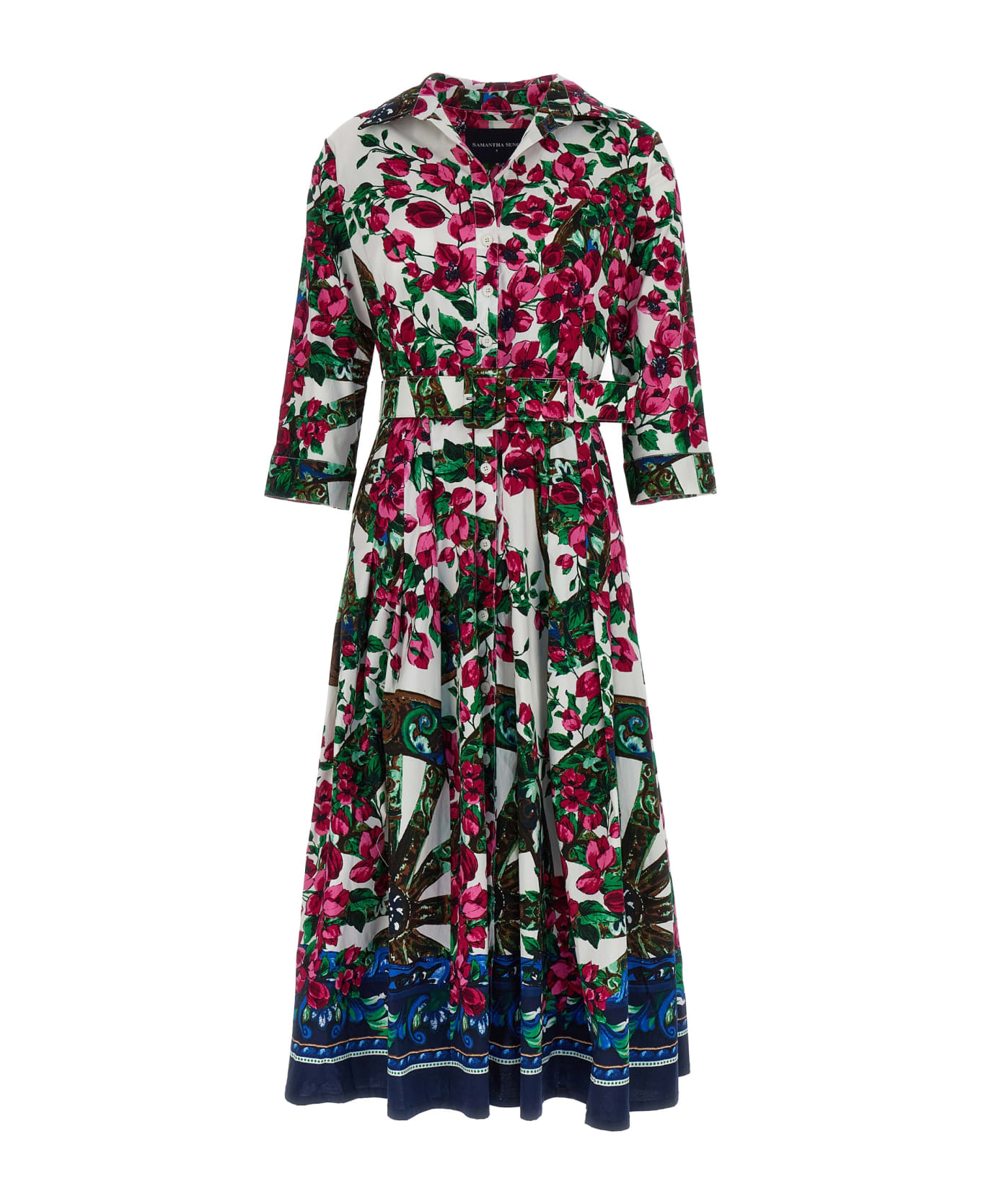 Patricia' stretch cotton midi dress with all-over 'antique wheel border' print, front button closure, pleated skirt, shirt collar and long cuffed sleeves.