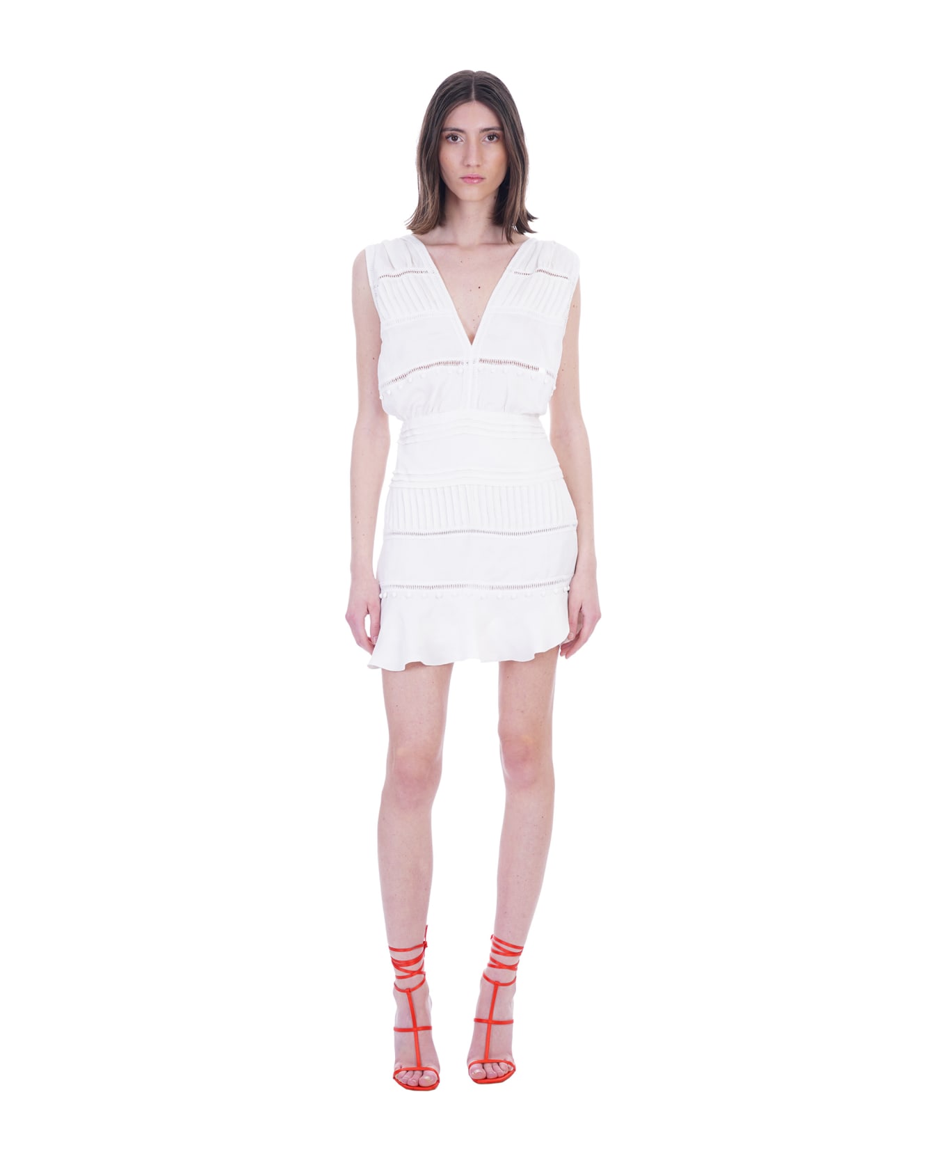Pavi Dress in beige cotton, V neck, sleeveless, embroidered detail, zip clousure, 21% linen, 7% cotton, 72% viscose, Model is 180 cm and wears 36