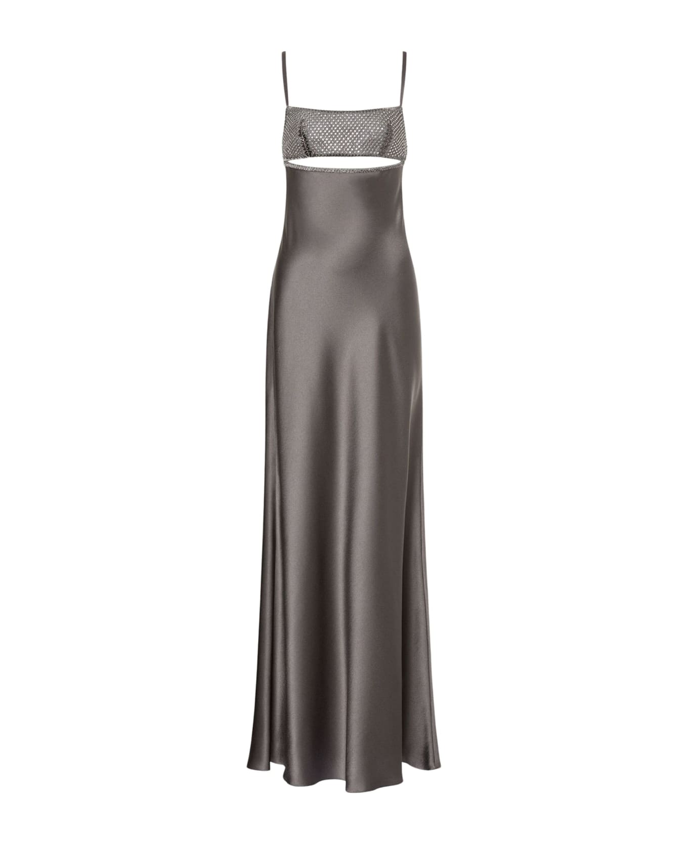 Beaded Rhinestone Dress - Alberta Ferretti - iron color - satin finish - straight neckline - thin straps - beaded and rhinestone embellishments - cut out detail - toe length